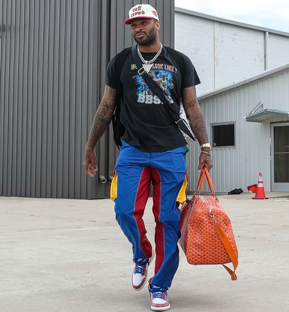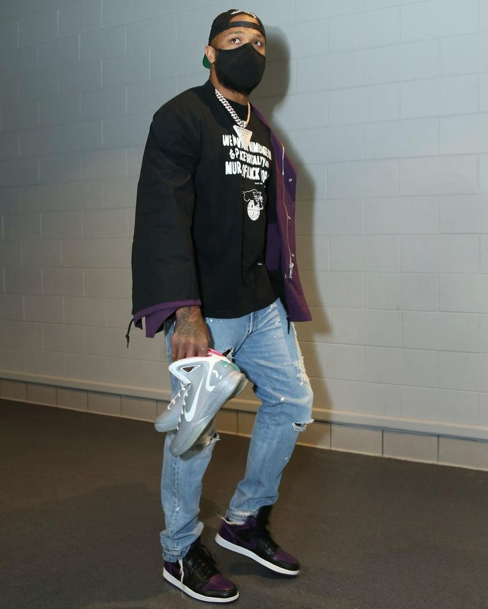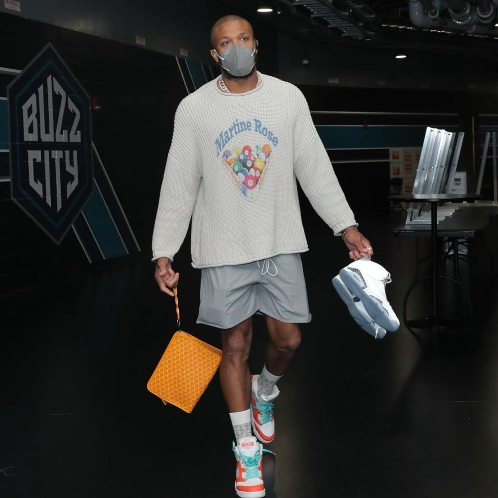 今年夏天,塔克跟随雄鹿收获冠军后,以自由球员身份加盟热火,随机在媒体定妆照上脚一双为歌手贾斯汀·汀布莱克打造的亲友限定 Air Jordan 1 “Legends of Summer”。