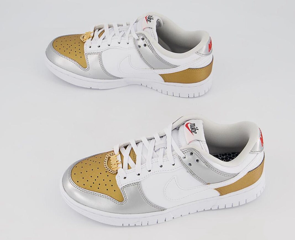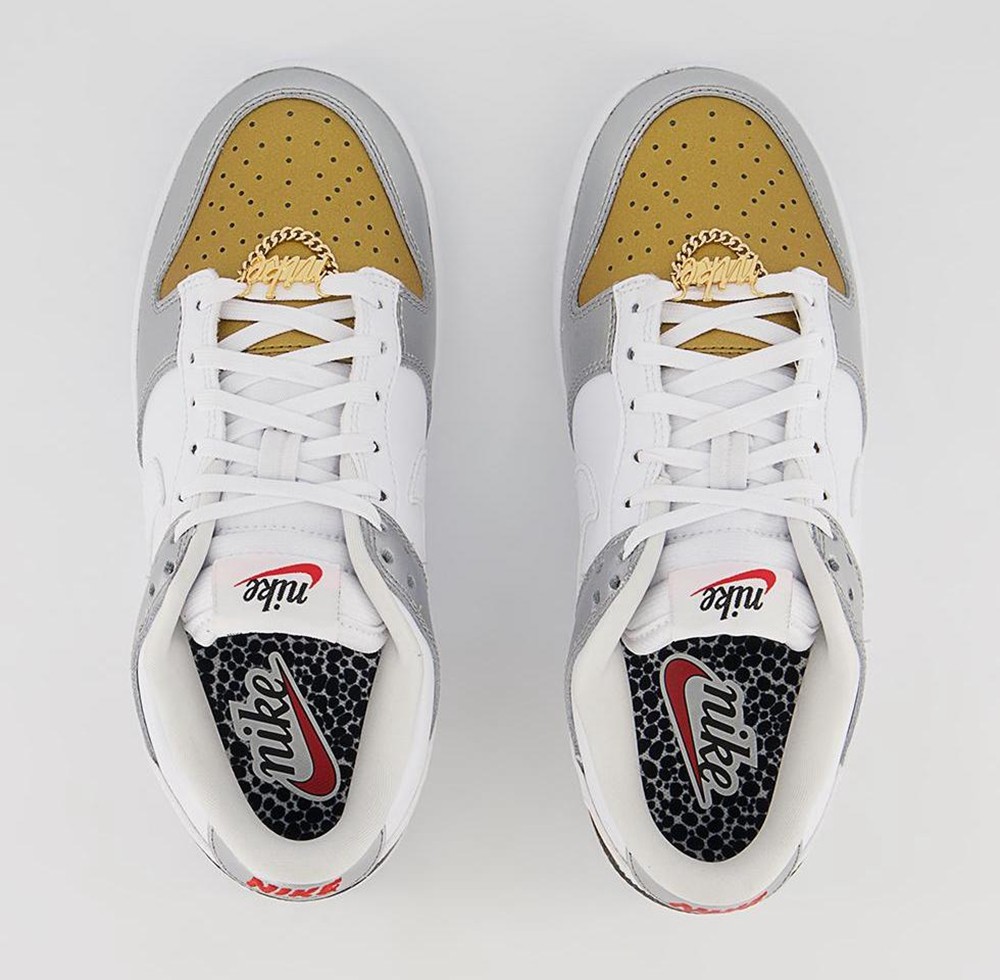 最大的亮点来自于鞋带上自带 Nike “项链” ,纯金色的金属鞋带扣给整双鞋增加了浓厚的嘻哈风格。