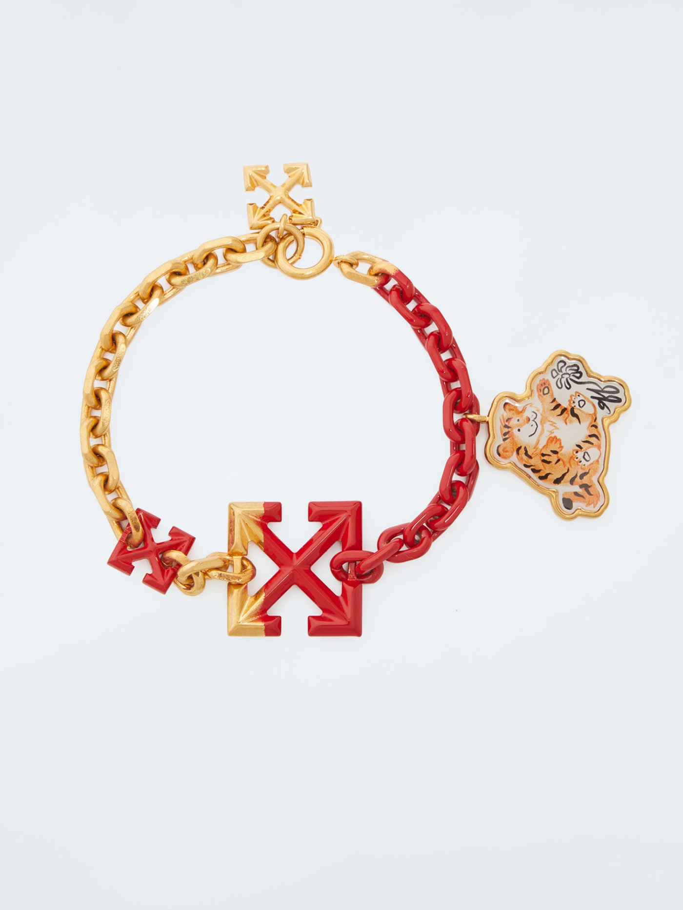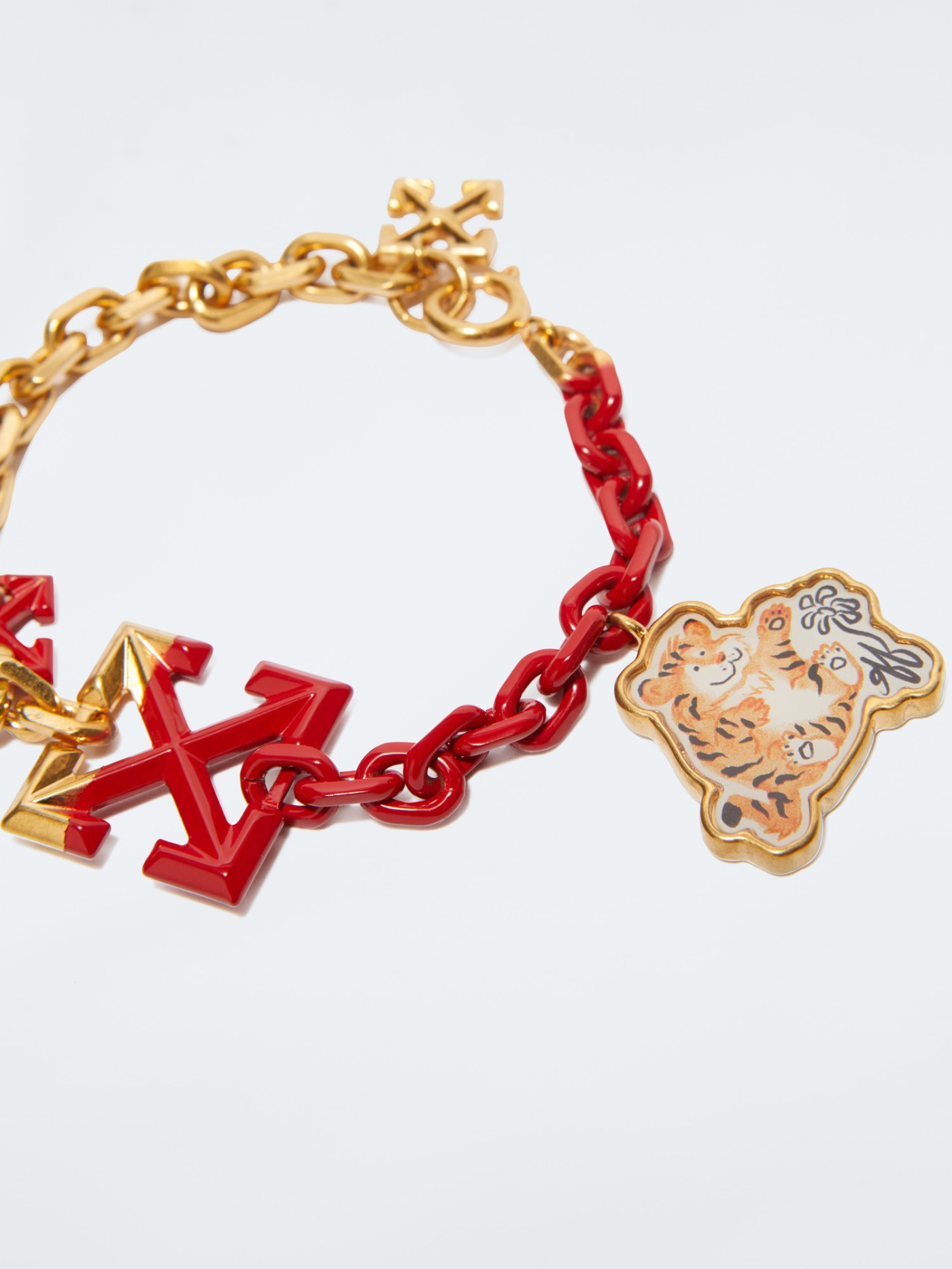 Off-White™ 以红绳为原型,用环形链条巧妙地替代传统编织绳线,金红撞色象征好运,将标志性箭头 LOGO 与小老虎作为吊饰组件,趣味十足。