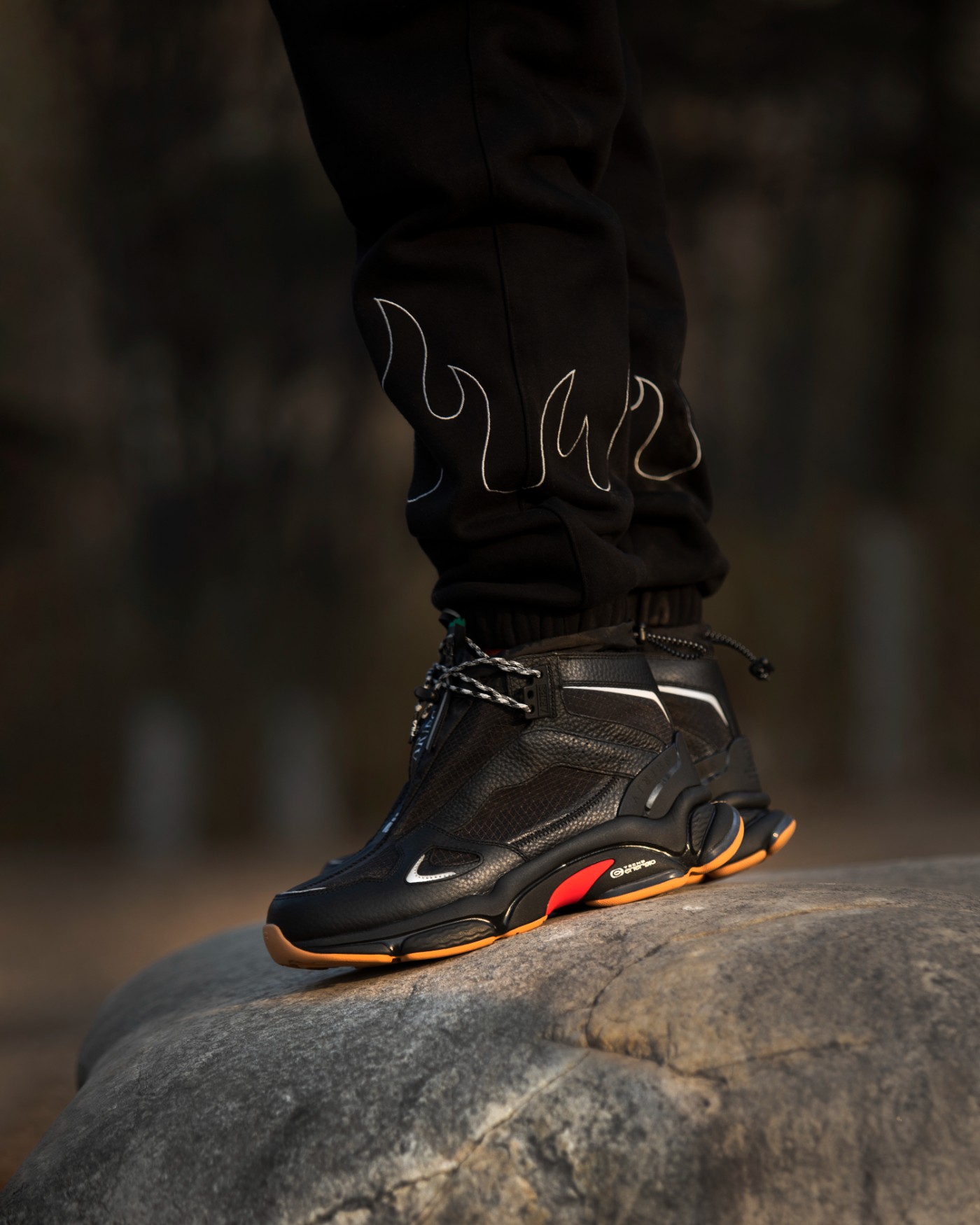 搭配方面,酷黑装扮上脚百搭不挑人,小编搭配一条来自 HACKMIND 品牌的简约风格运动长裤,刺绣工艺勾勒出火焰造型。