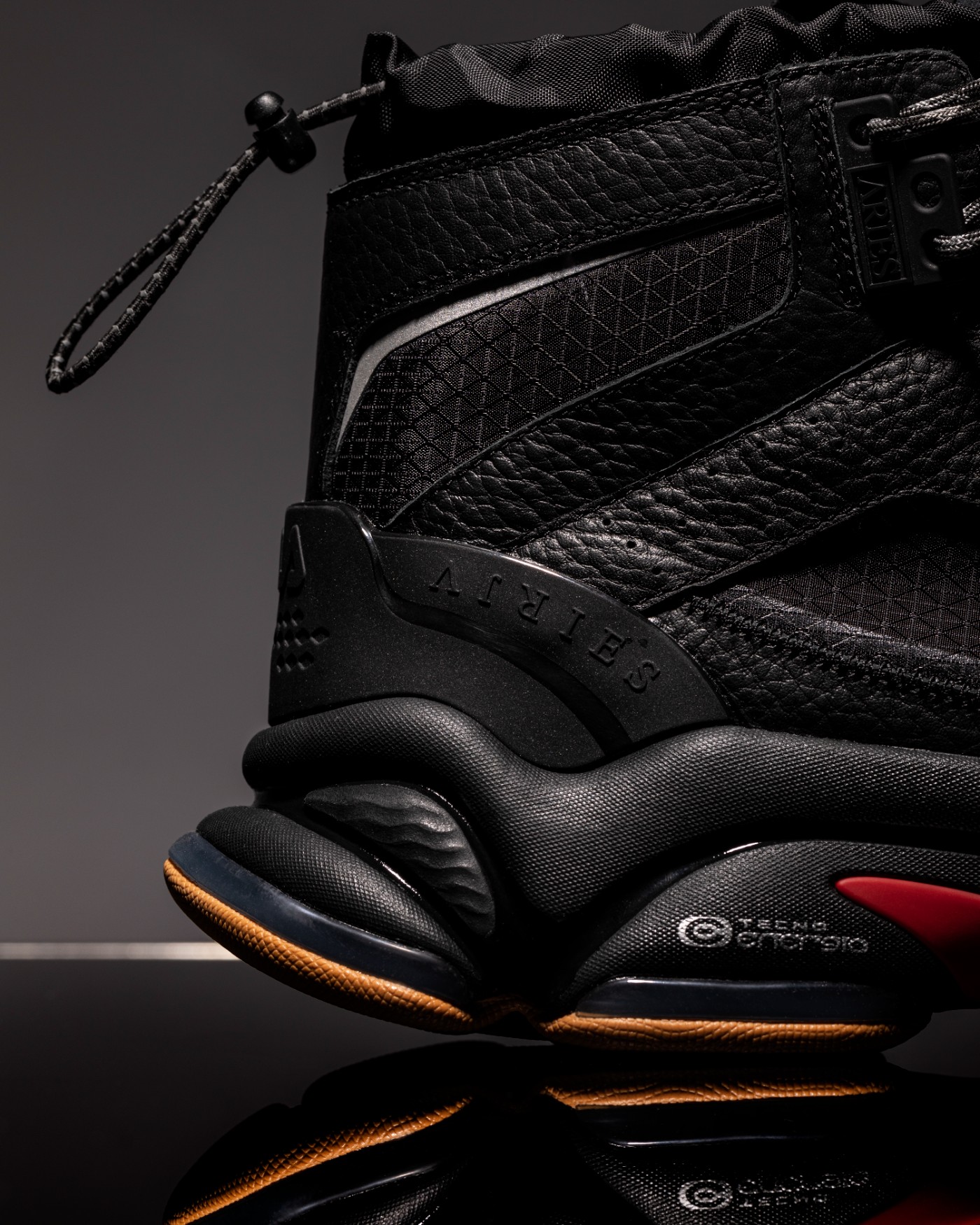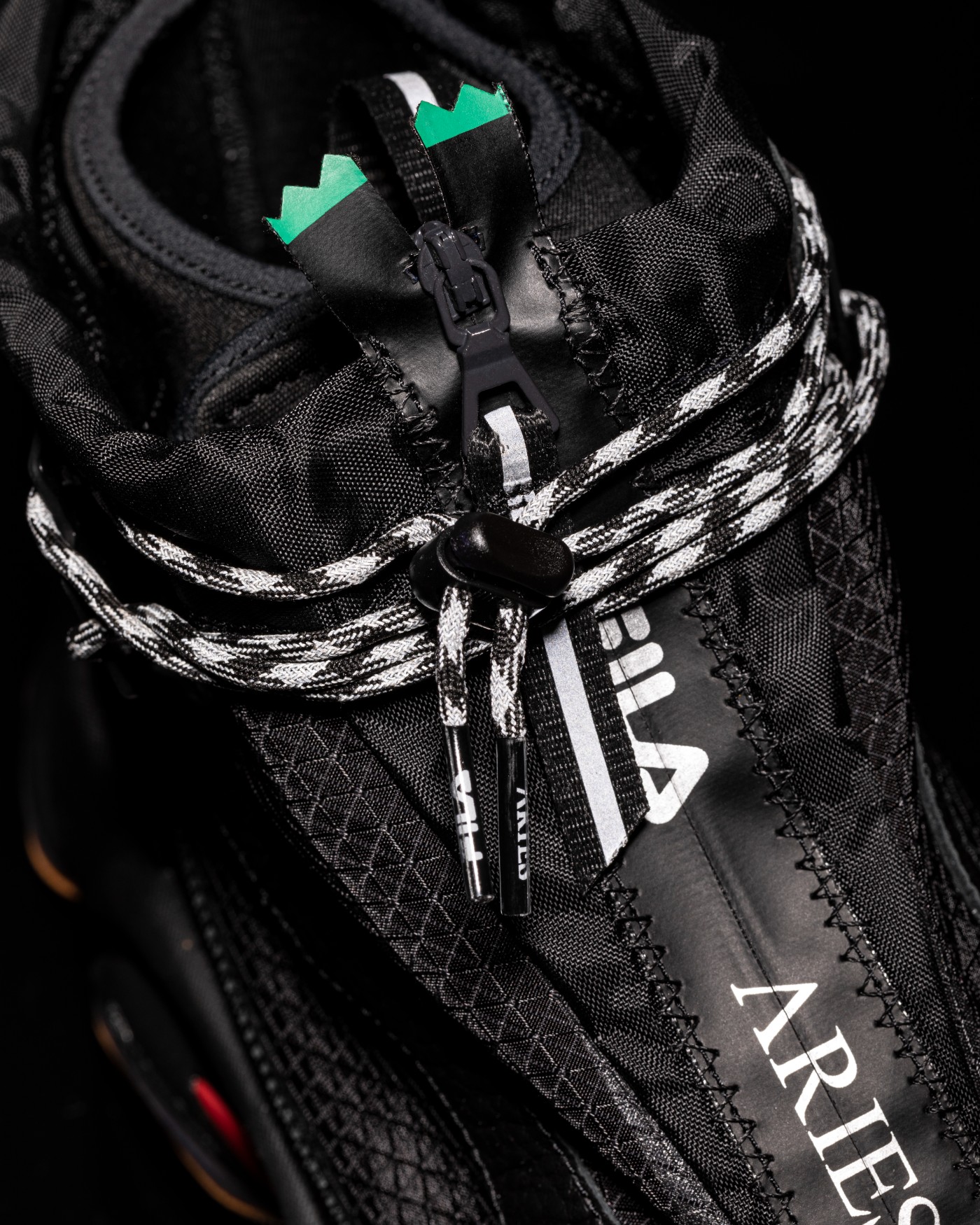 细节方面,防水拉链、鞋带扣以及后跟位置均可以看出点缀 FILA 以及ARIES LOGO,彰显联名身份。