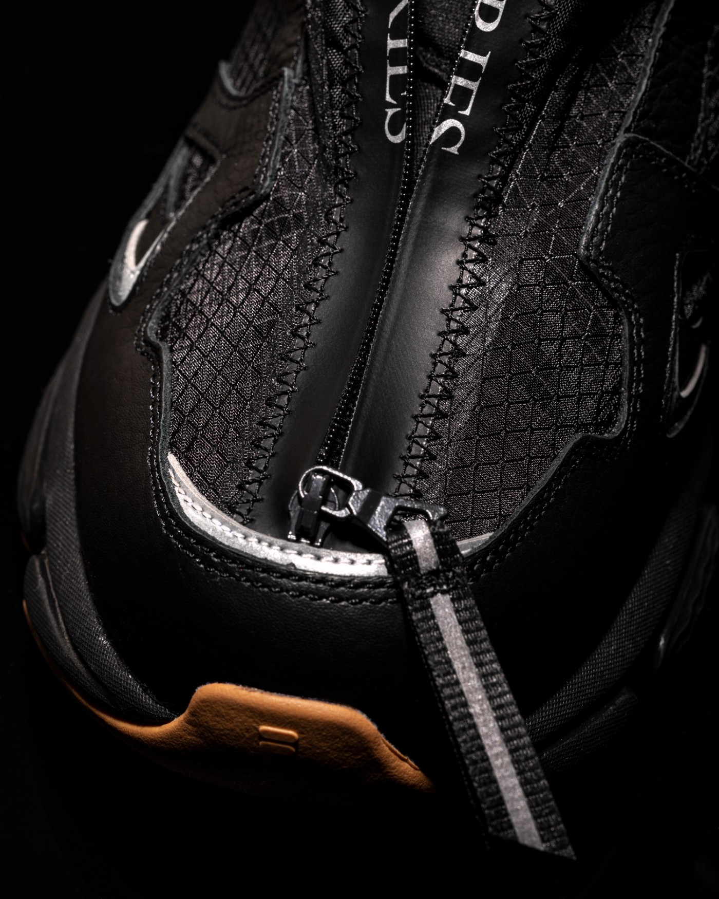 通过鞋面一直延伸到鞋头的防水拉链衔接。