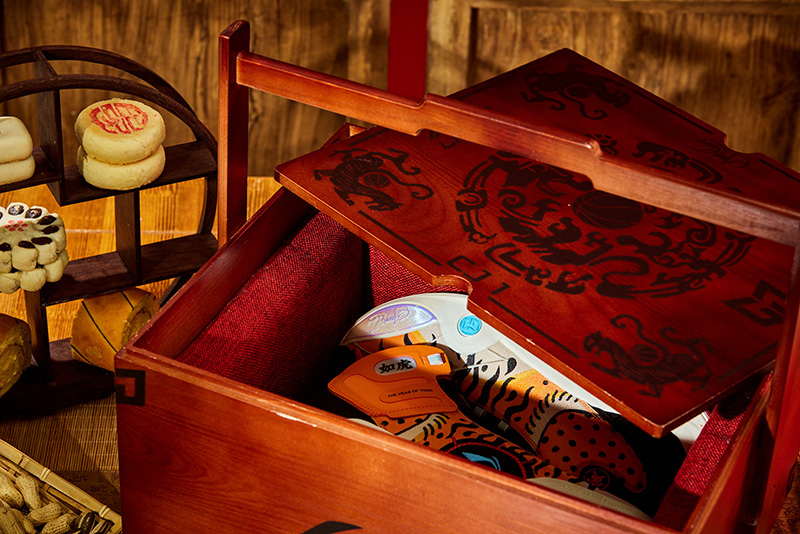 礼盒以中式糕点盒为灵感,采用双层设计。上层附赠福字、窗花、对联,送上节日祝福。