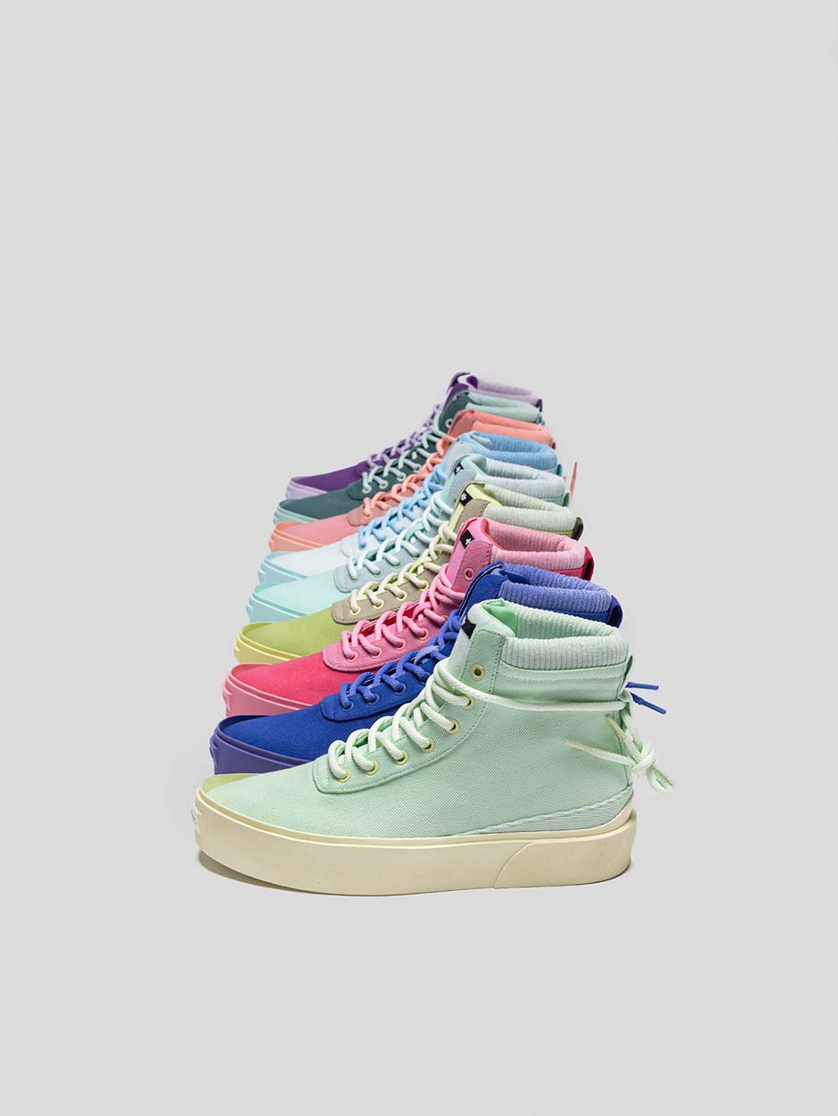 高帮款设计语言与低帮款相似,采用超长鞋带与厚布条纹的设计,带来百搭的属性与不错的质感。