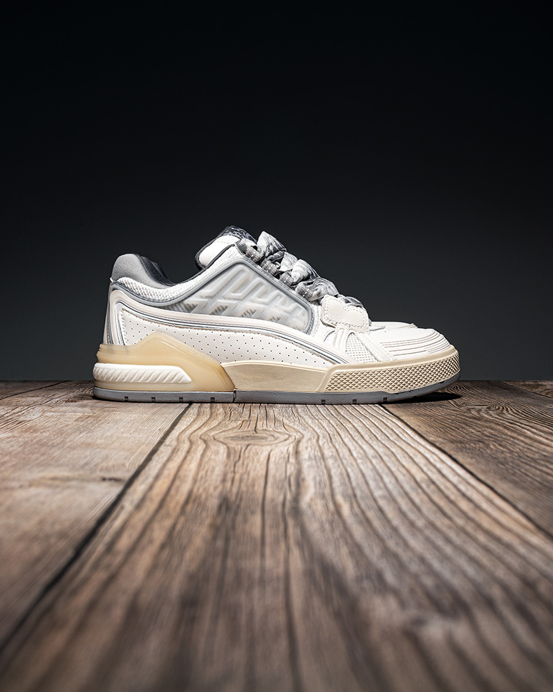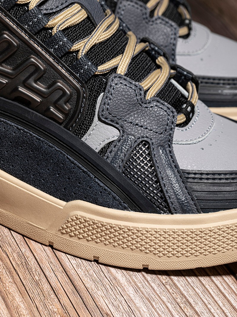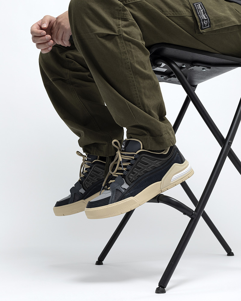 深色街头气质浓郁,侧边大范围麂皮与复杂的鞋身结构,释放出硬朗的肌肉感,搭配做旧中底与双色鞋带,视觉平衡拿捏的恰到好处。