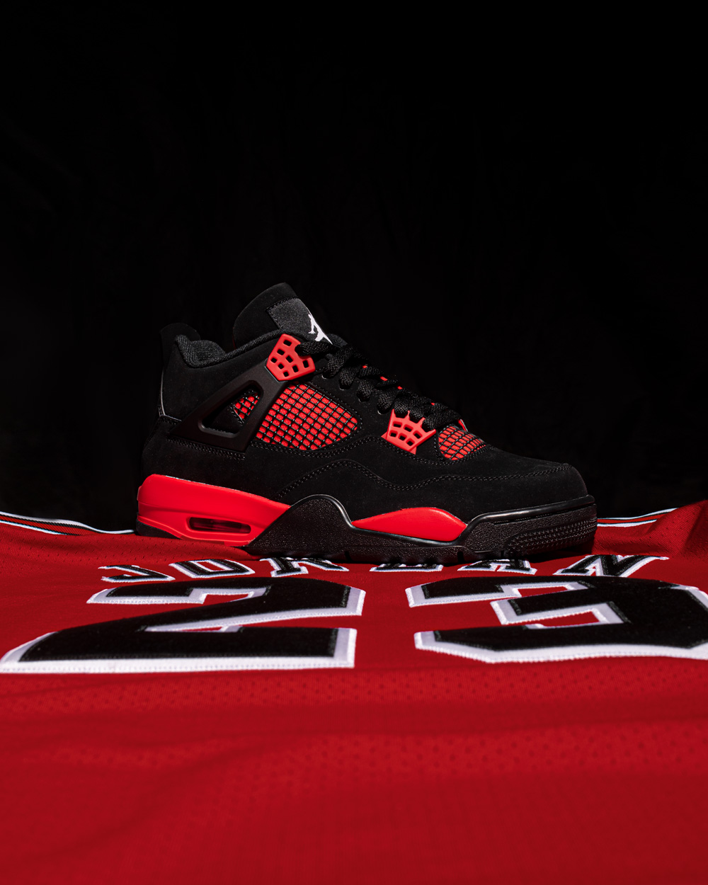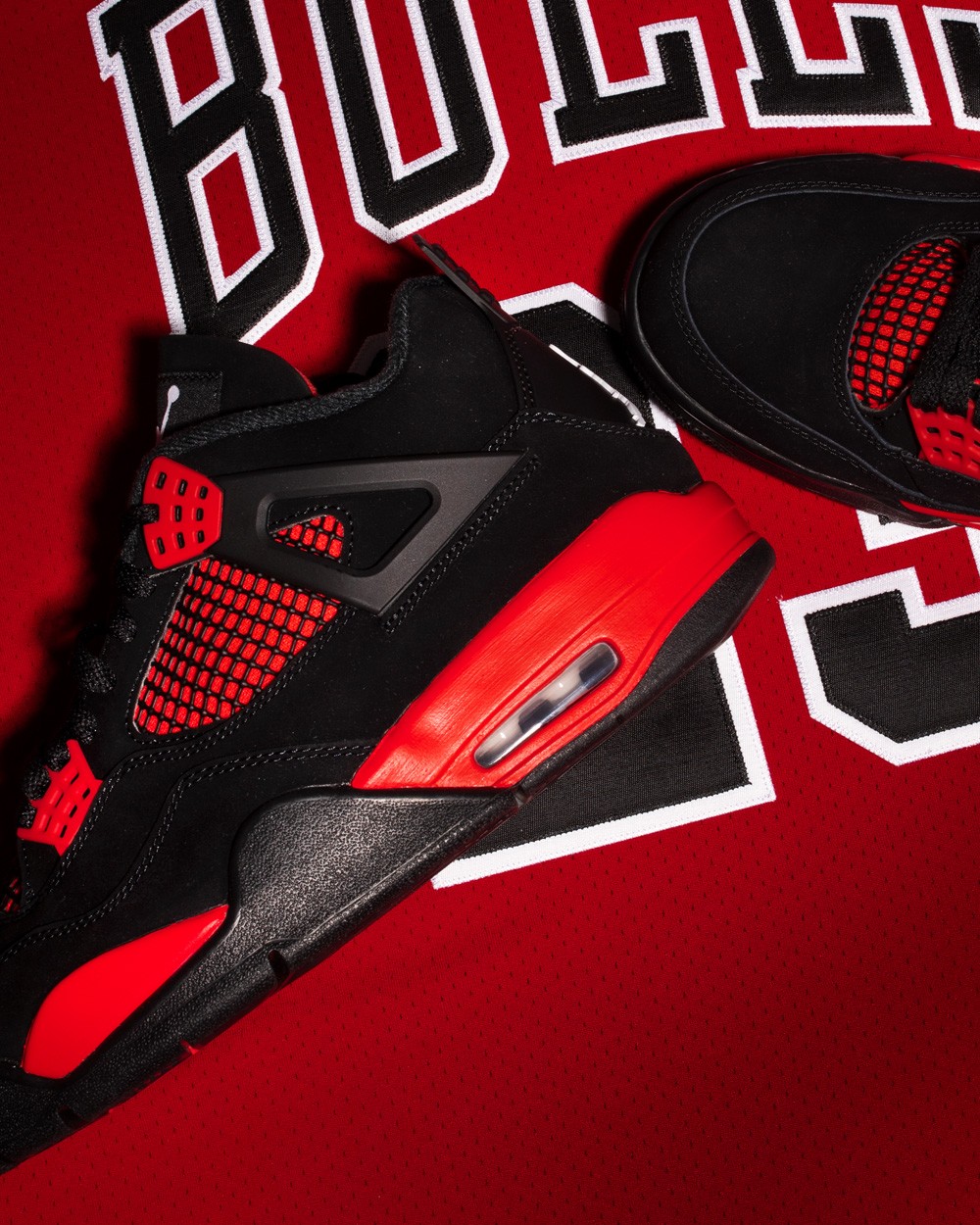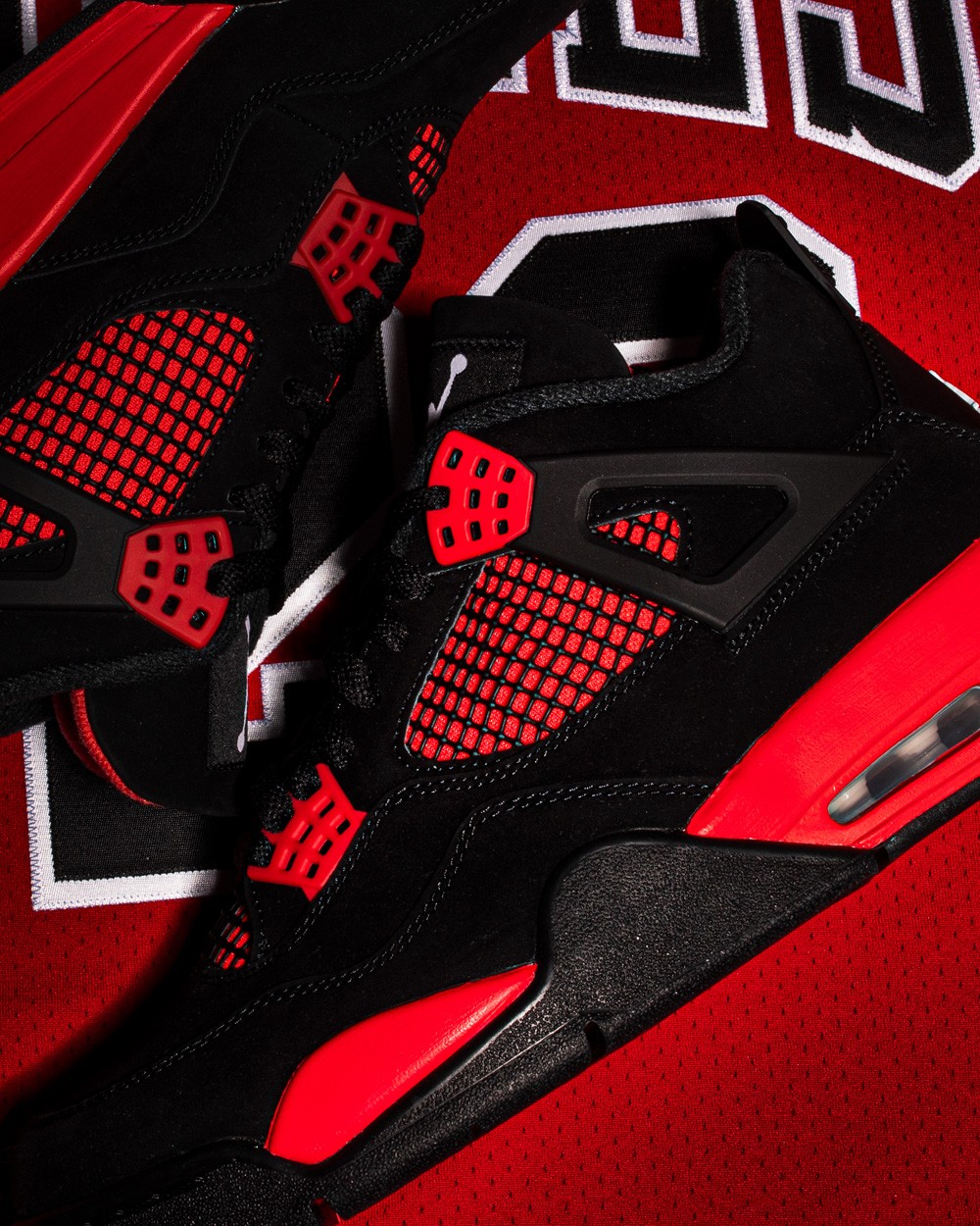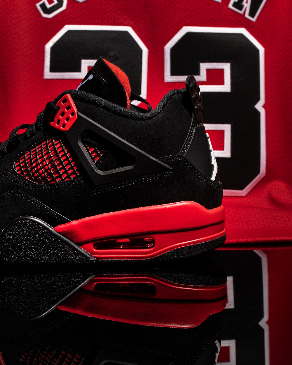 整双鞋的配色设计把 2012 年发售的「雷神」Air Jordan 4 鞋身中的黄色换为红色,尽显黑红的魅力,更被不少玩家称为「红雷神」。