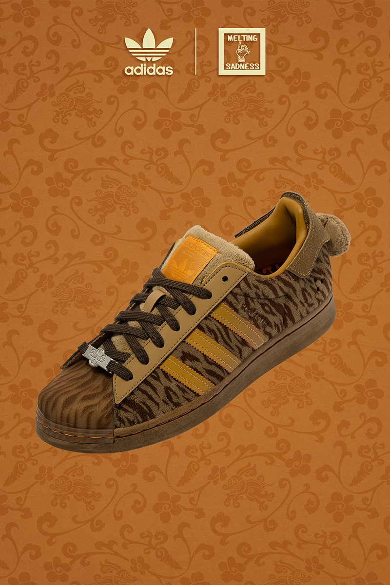 本次首轮鞋款围绕 Superstar 为蓝本,共发售 2 款配色。其中一双将 Melting Sadness 标志性卡通角色 KARORO 等形象和特点,注入鞋身各处细节,另一款则以虎纹元素贯穿鞋身,营造出玩味的 “童趣世界”。