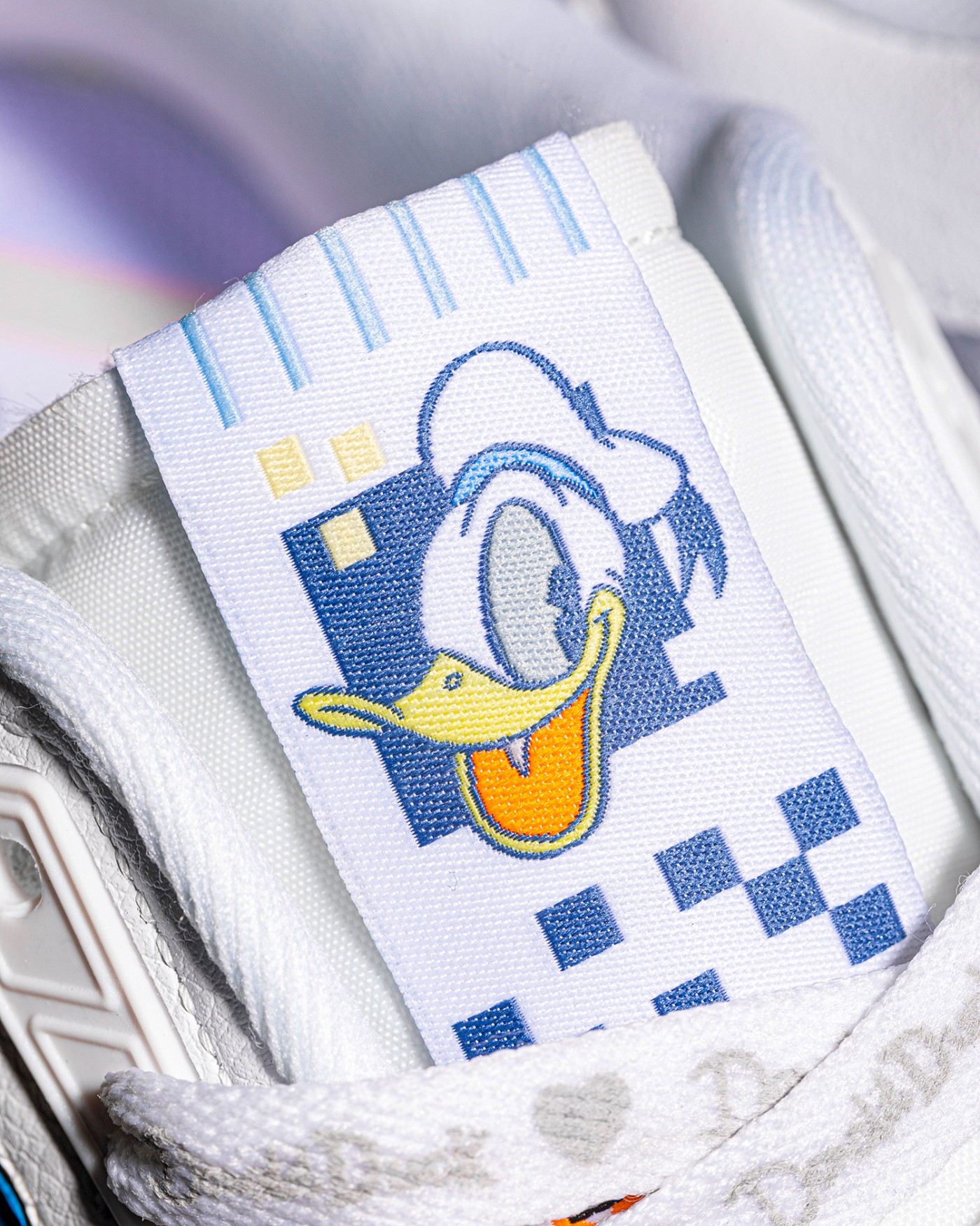 细节方面的独特之处在于,左右脚鞋舌上均带有唐老鸭头像。