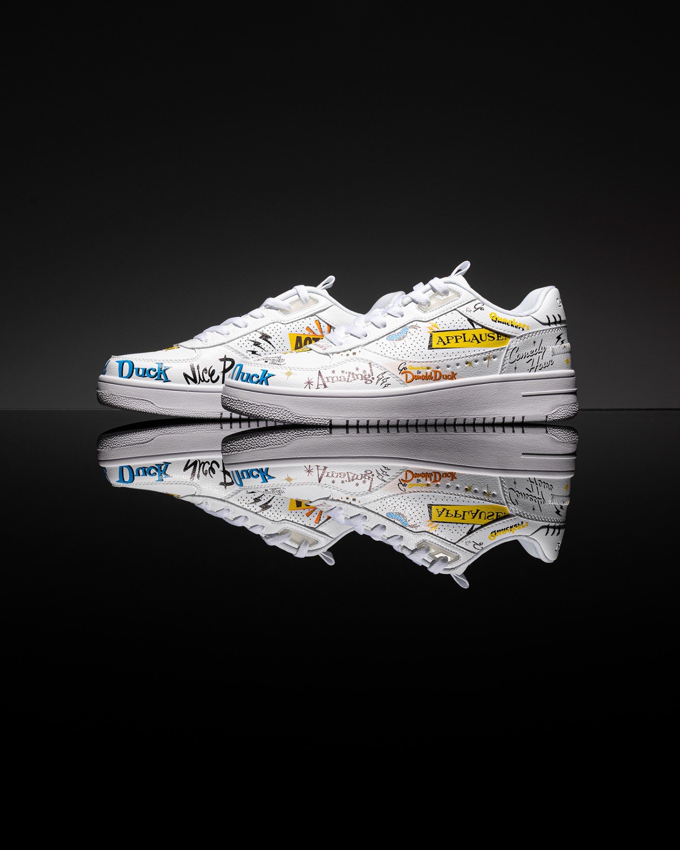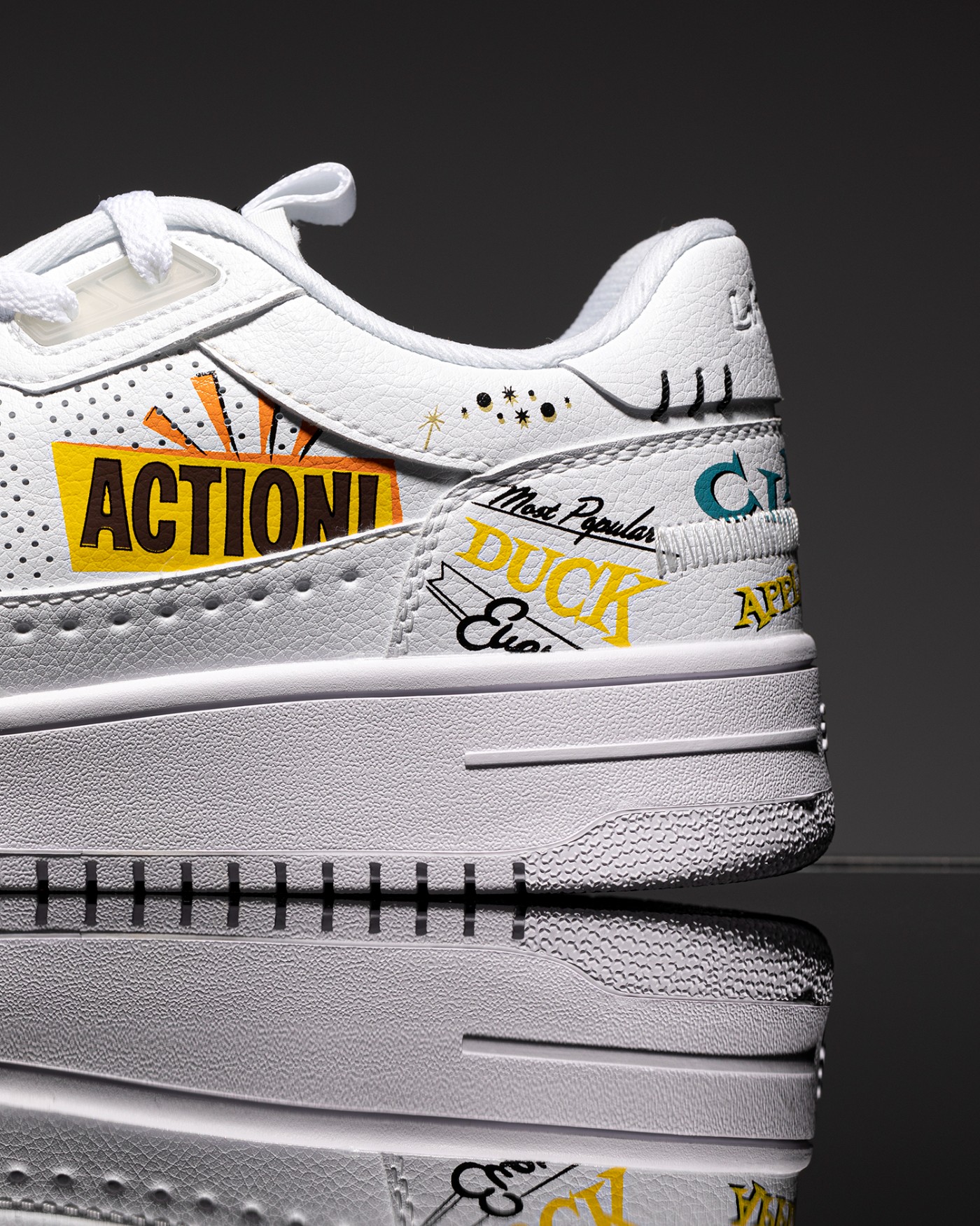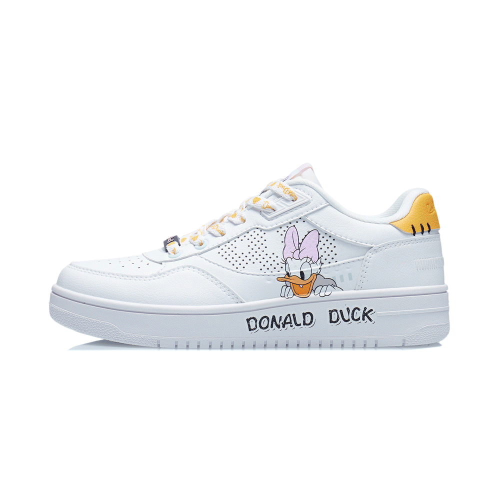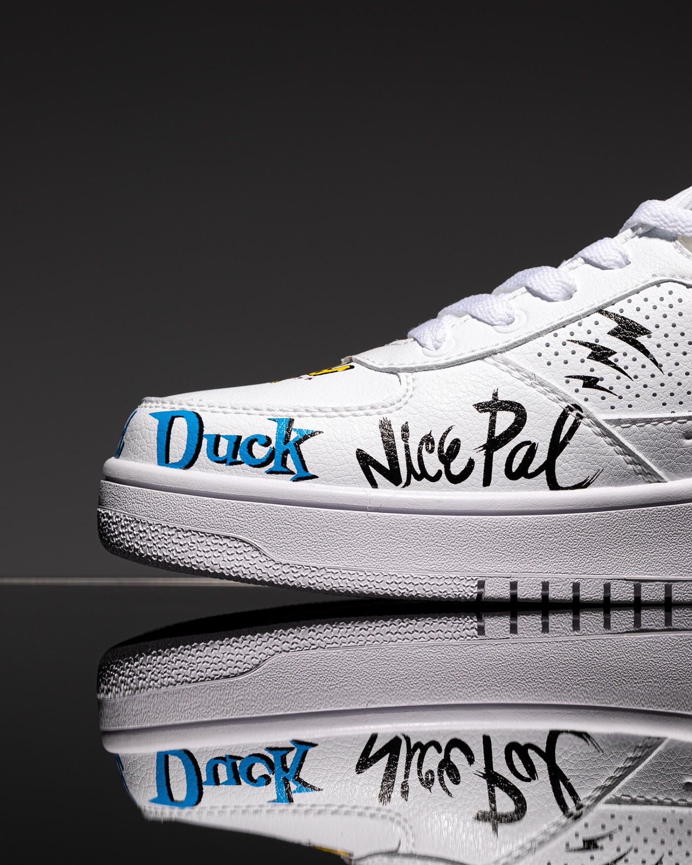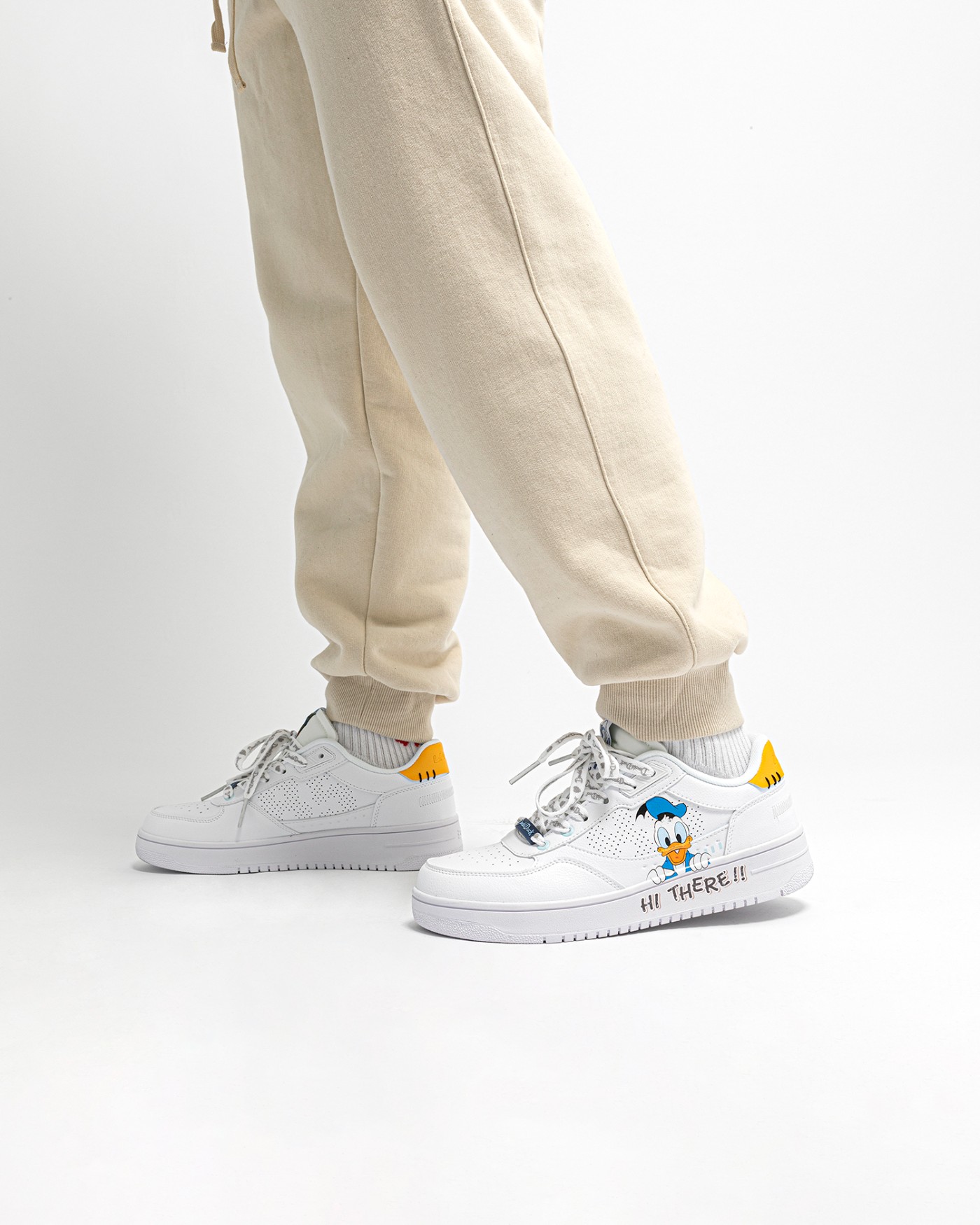 第三款俨然就是将纯白鞋身幻化成画布,在鞋身中部点缀涂鸦风格的唐老鸭经典形象。