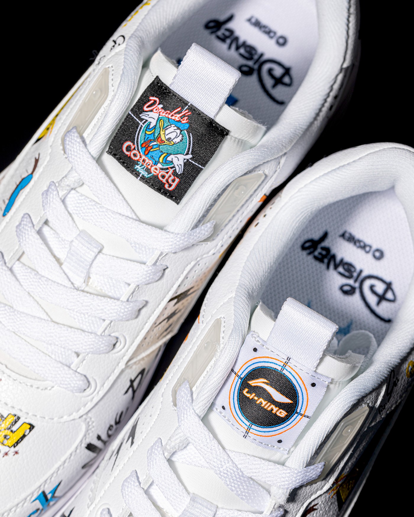 左右脚鞋舌标签也分别呈现李宁 LOGO 以及唐老鸭形象,显示联名的高贵身份。