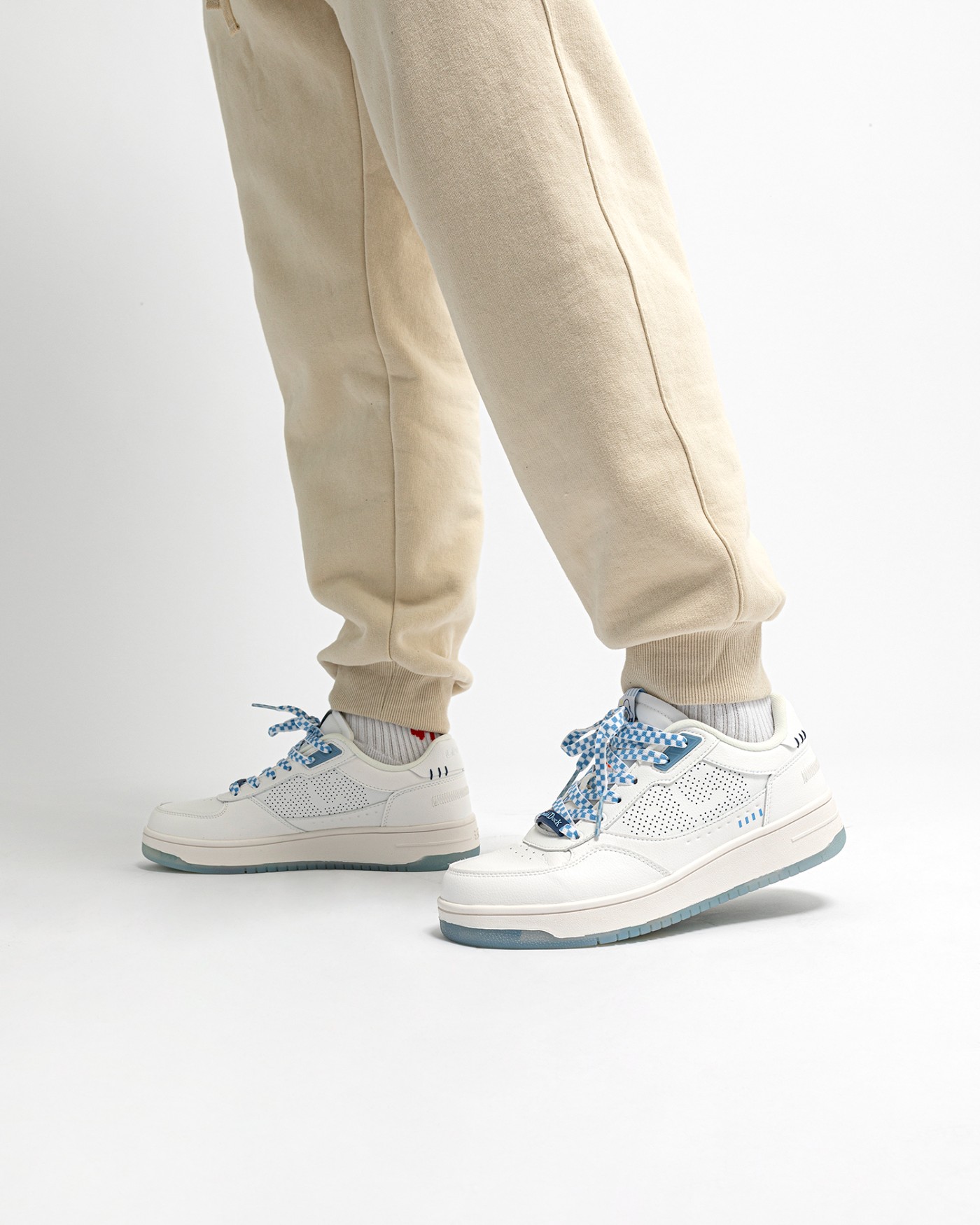 第二双则是更加纯粹的小白鞋风格,纯白皮革材质搭配上蓝色细节妆点鞋身。