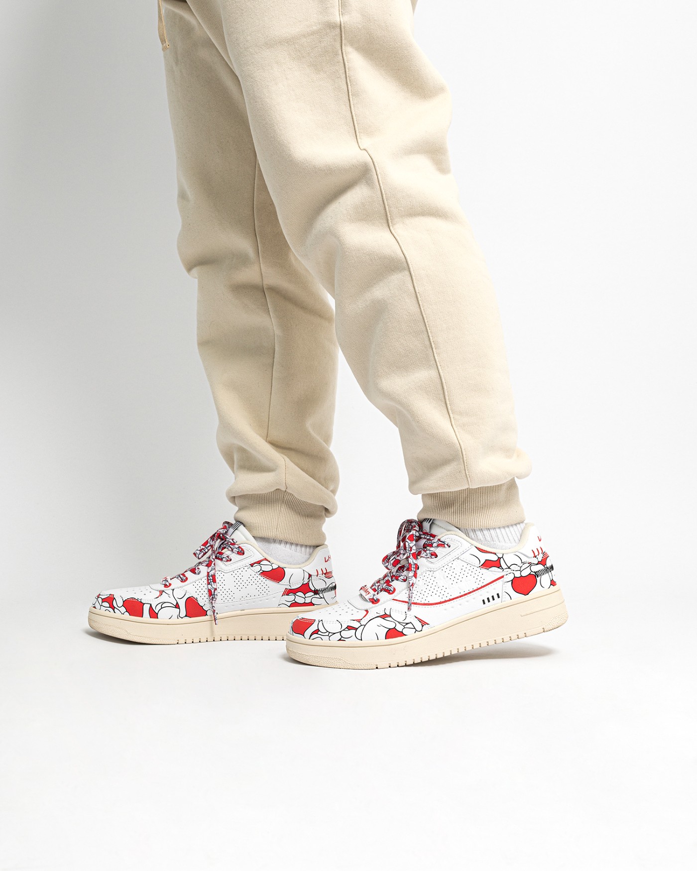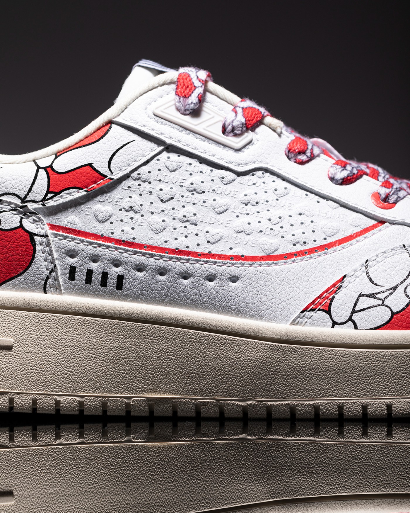 首先就是这双满印 Disney 经典手势爱心符号的小白鞋,彰显出「大胆表达爱意」的观念。