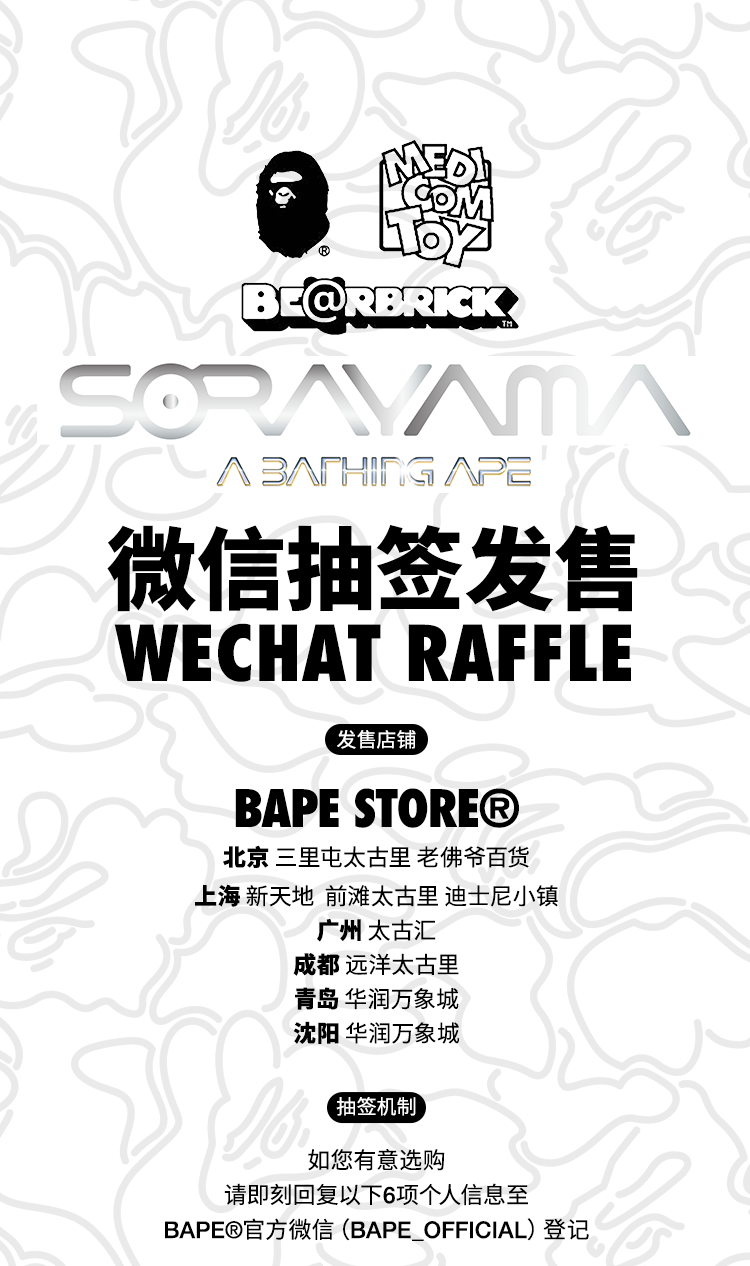 官方现已开启微信抽签发售,抽签登记截止时间为 1 月 27 日上午 10 点,将于 1 月 29 日上午 10 点公布中签名单,建议大家还是关注 BAPE 官方微信公众号了解登记详情。