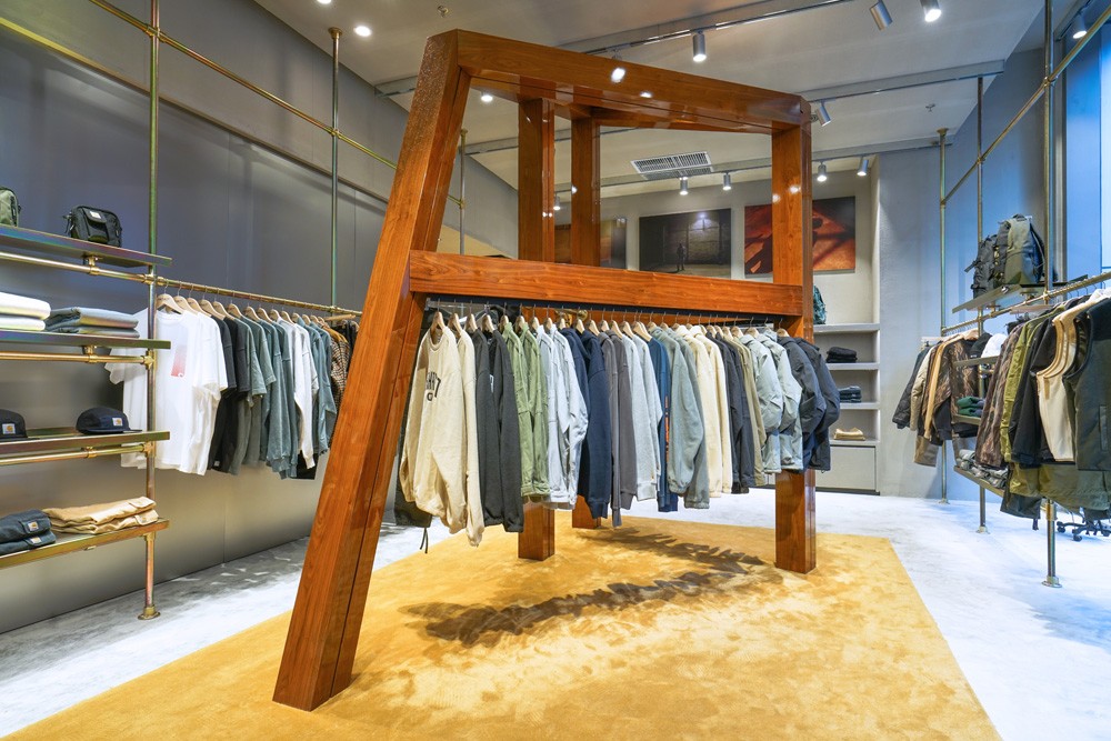 不规则的胡桃木组架,营造极具工艺感的轮廓线条,呈现 Carhartt WIP 的实用美学。