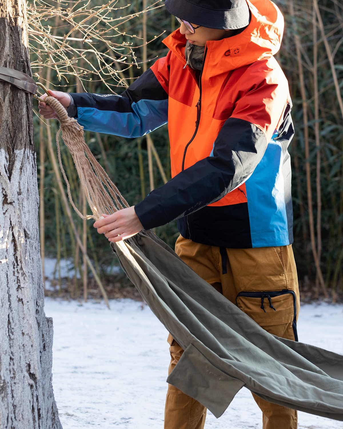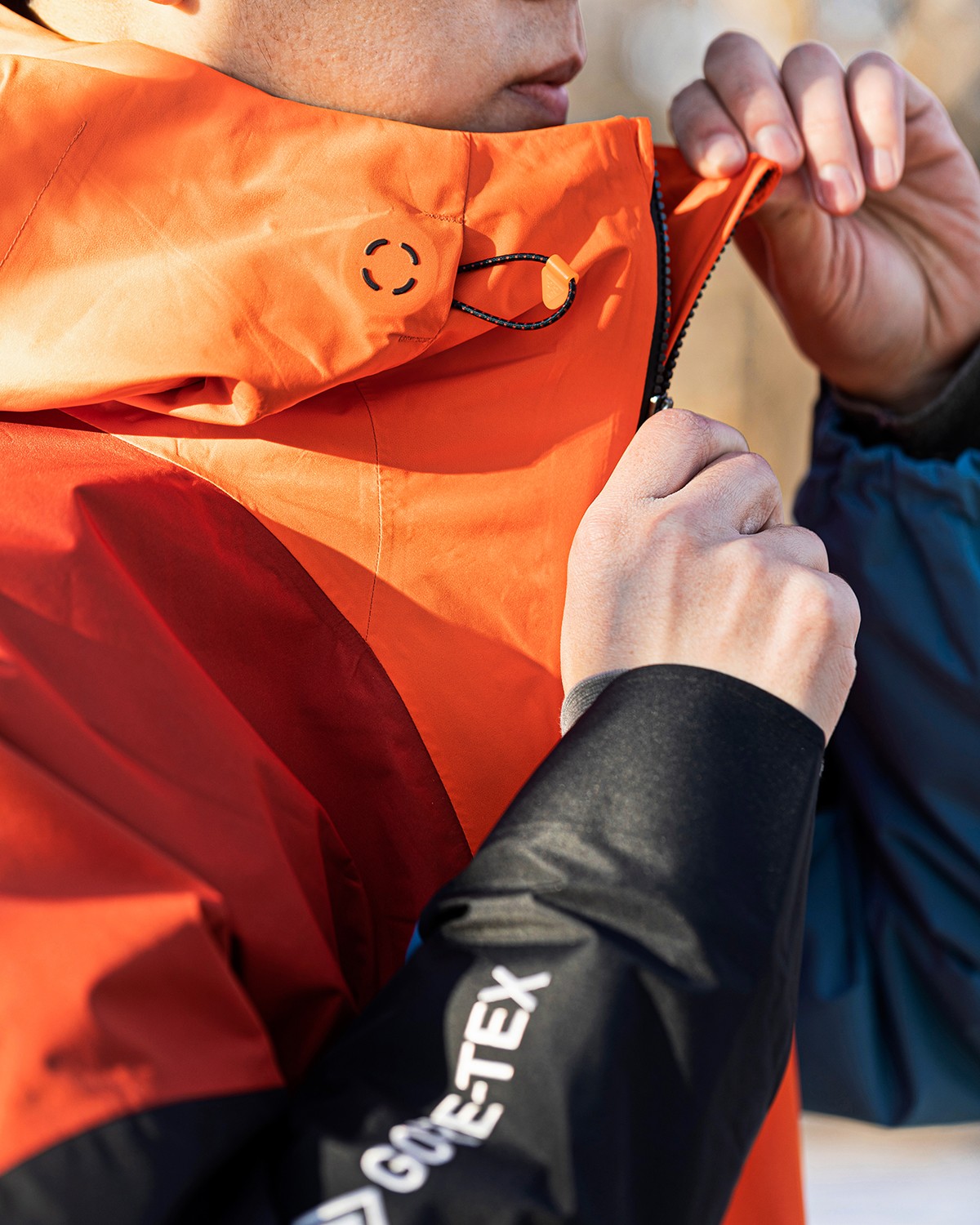 风帽、衣领与下摆,都带有单手即可操作的松紧设计,方便快速调节。