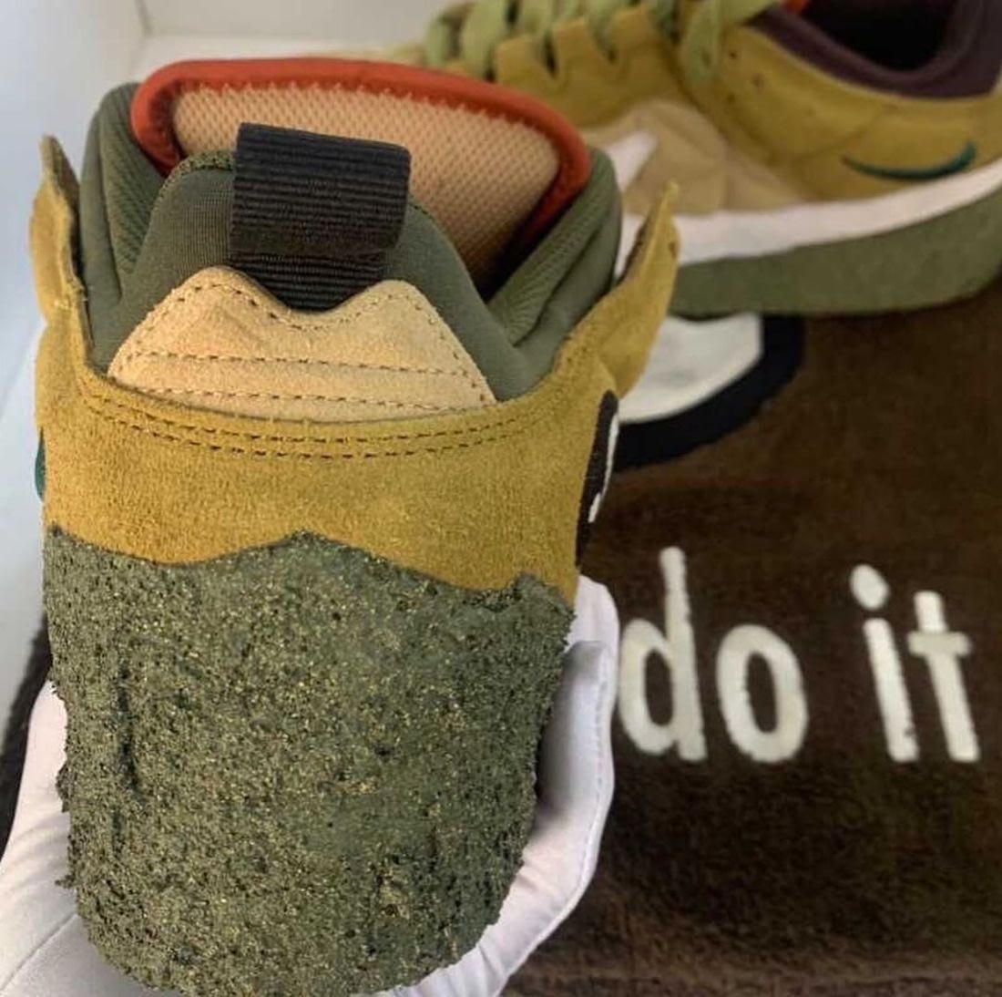 整双鞋以绿色为主调,鞋面的绿色偏黄,中底则是墨绿,不同深浅的绿色呈现出不错的层次感,翻毛皮鞋面上有三角形的缝线纹理。