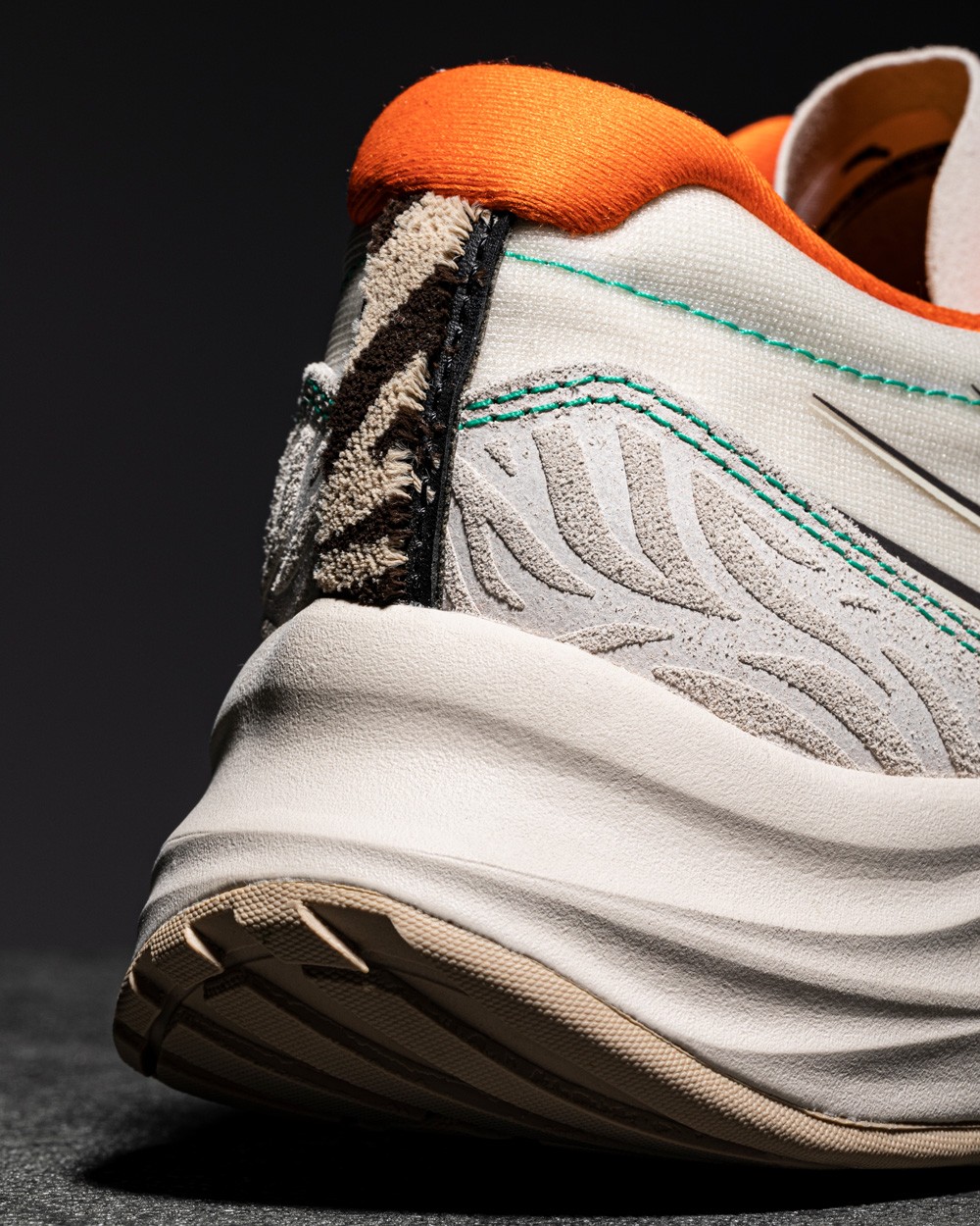 鞋面以透明纱线打造,搭配骨白色以及橙色、绿色点缀,呈现出不同于一般虎年配色的造型。
