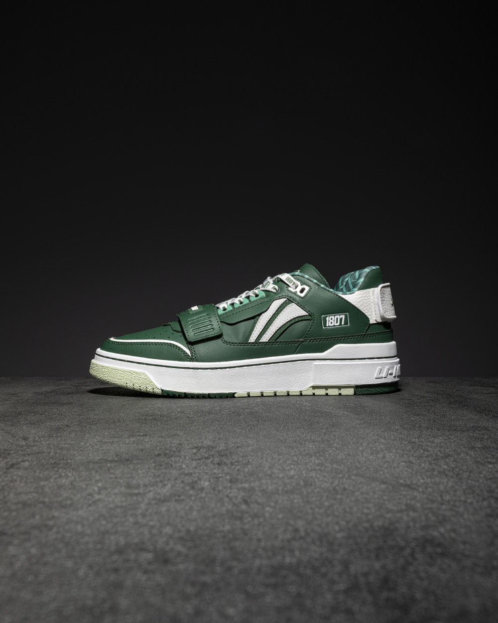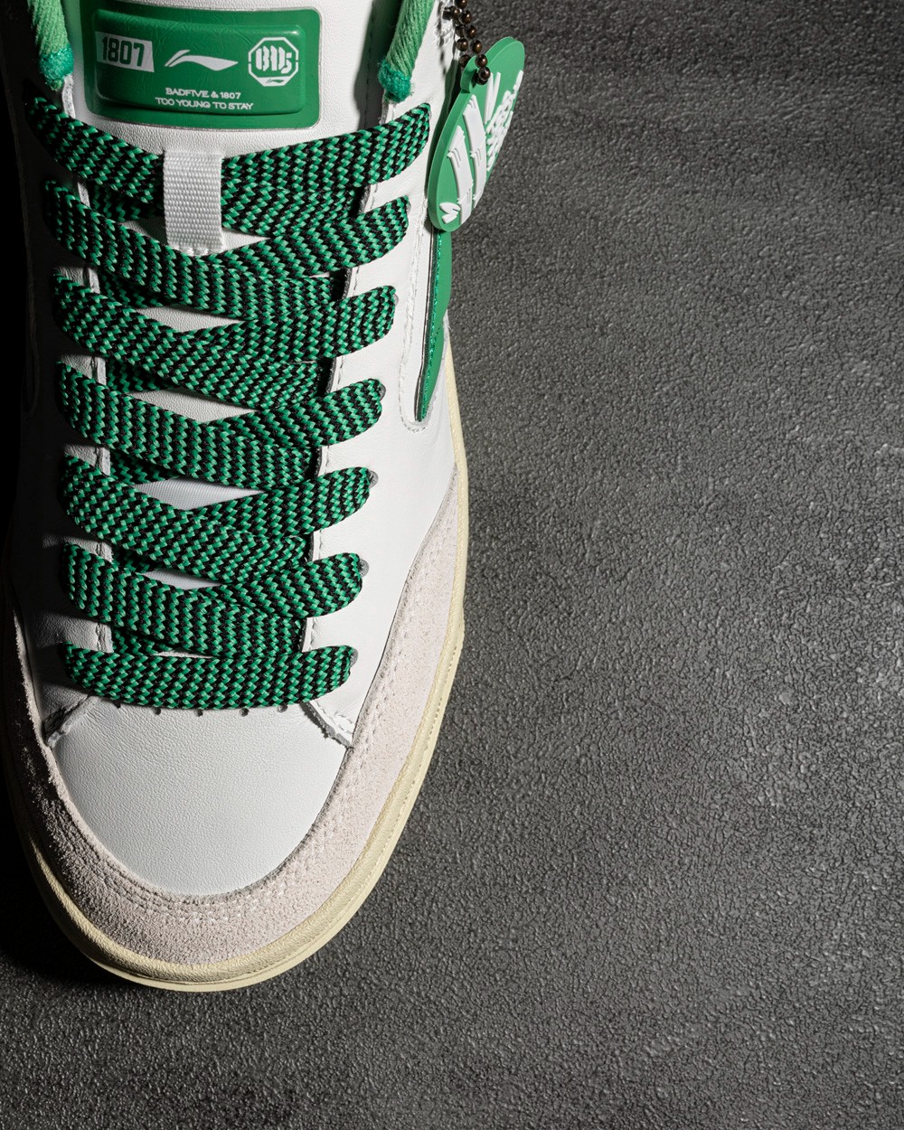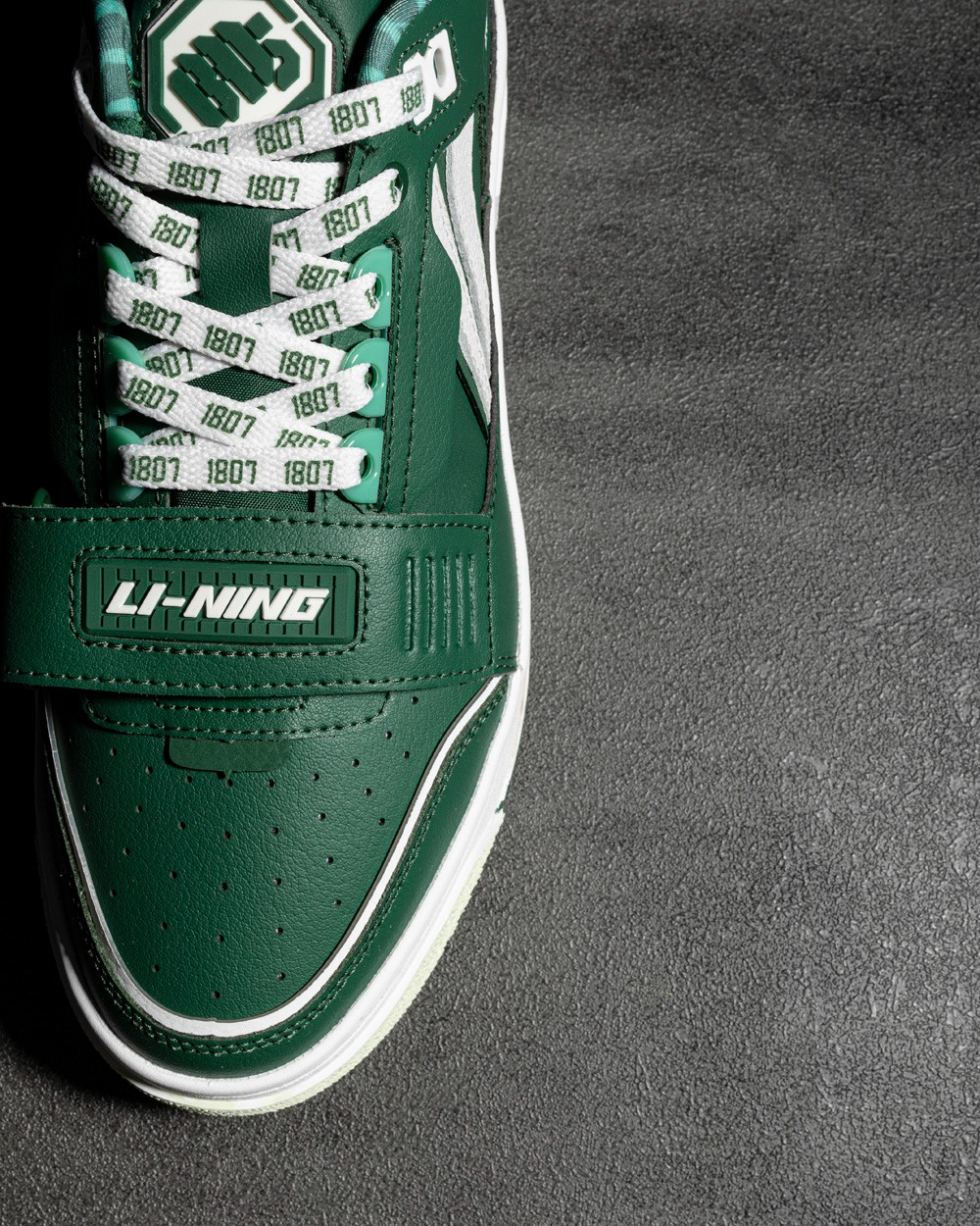 鞋舌标签彰显 1807 和李宁的品牌身份,麂皮和颗粒皮革打造的鞋面层次感十足。