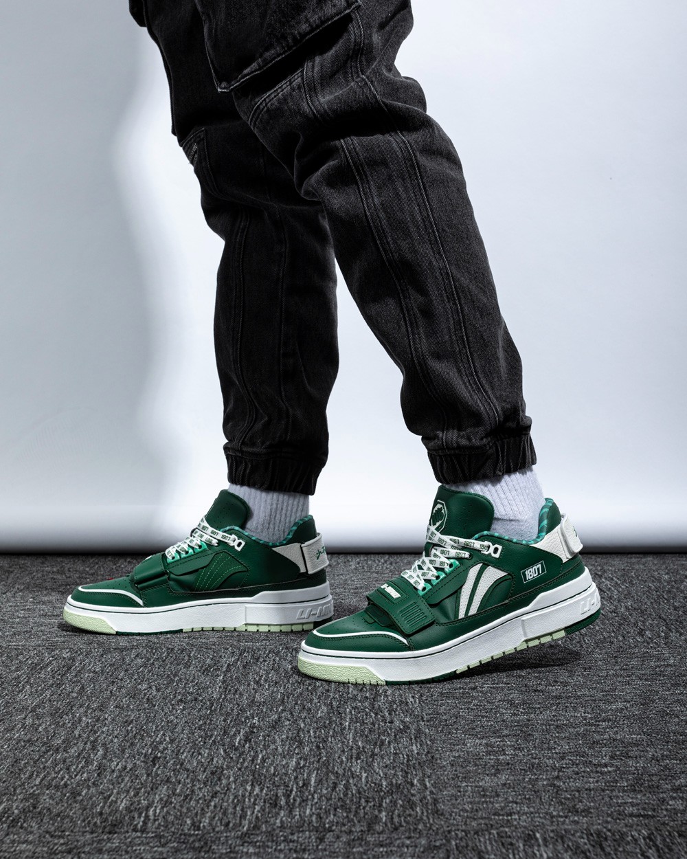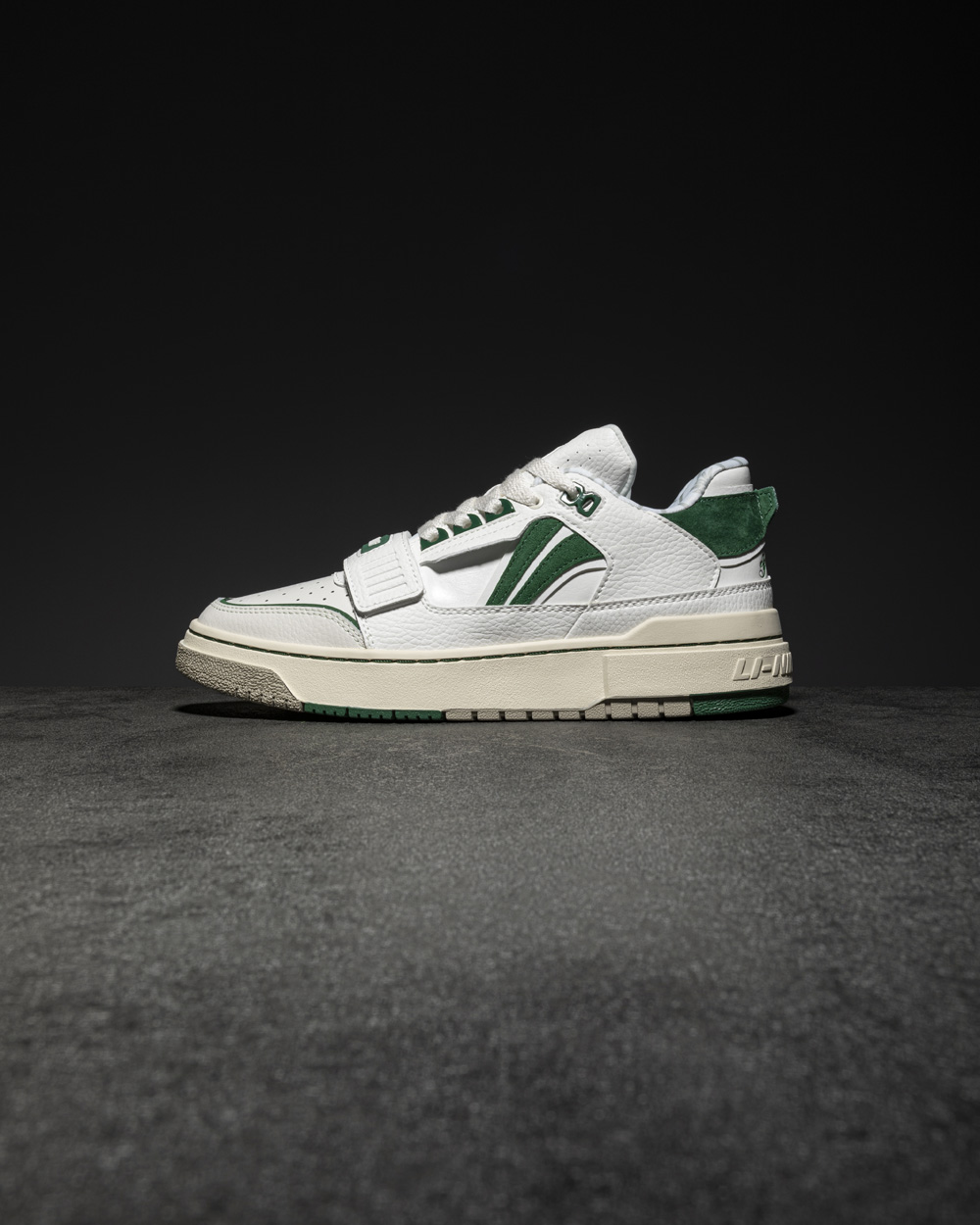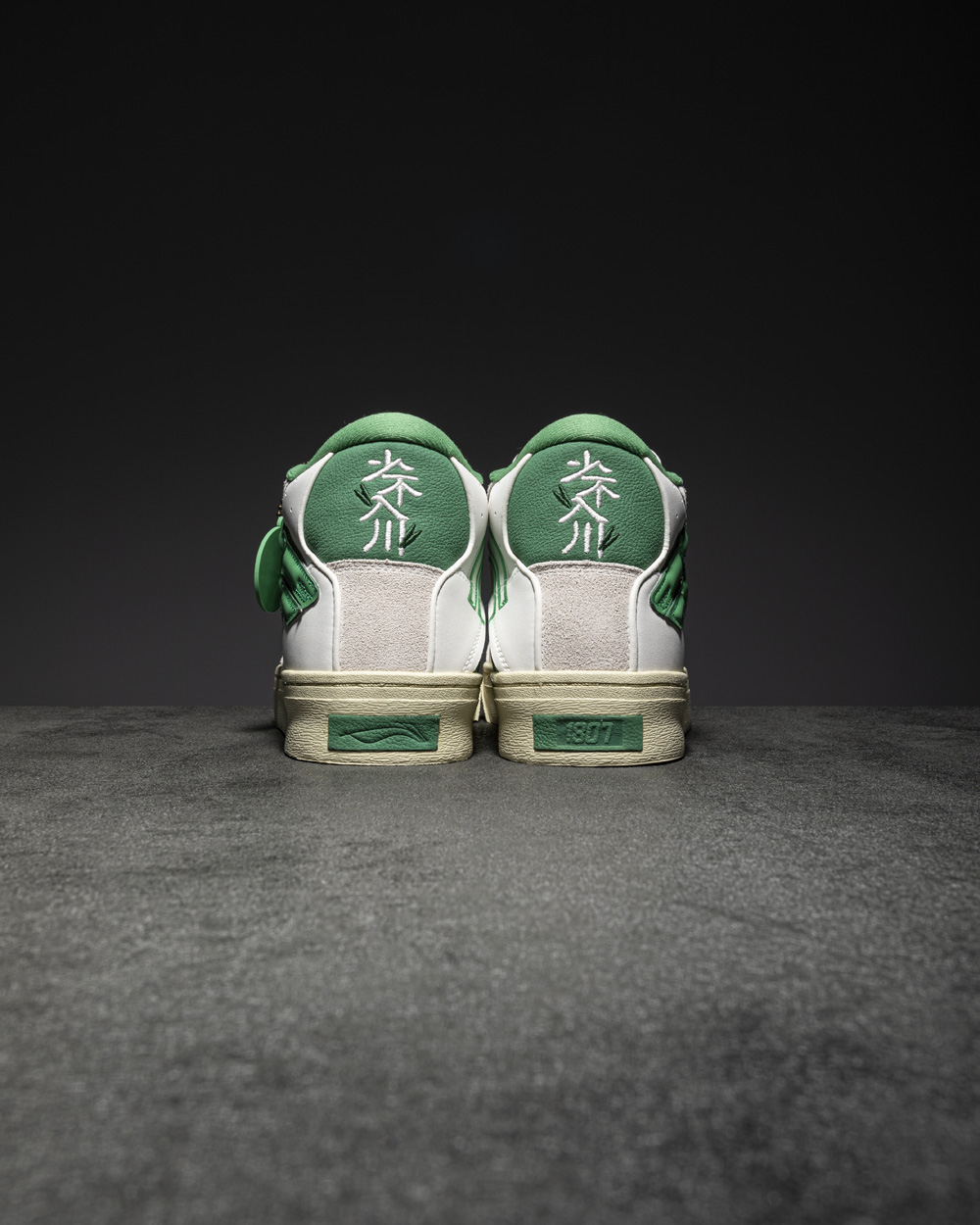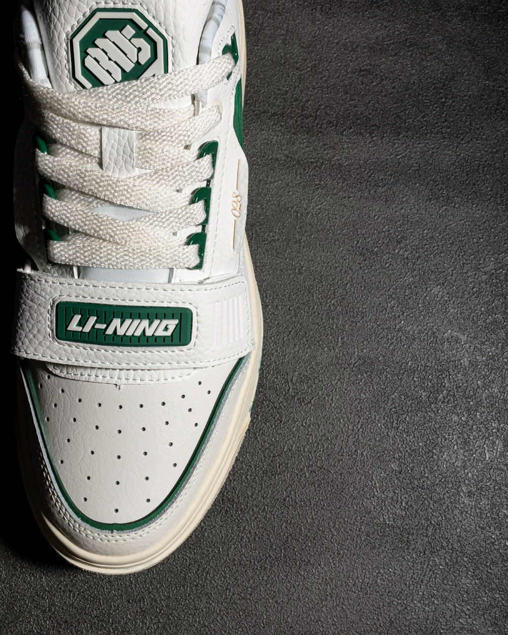鞋舌标签彰显 1807 和李宁的品牌身份,麂皮和颗粒皮革打造的鞋面层次感十足。