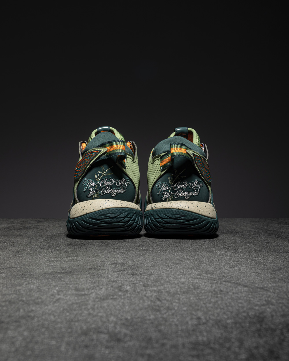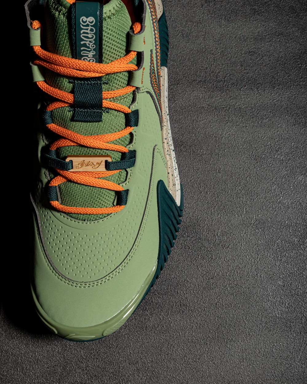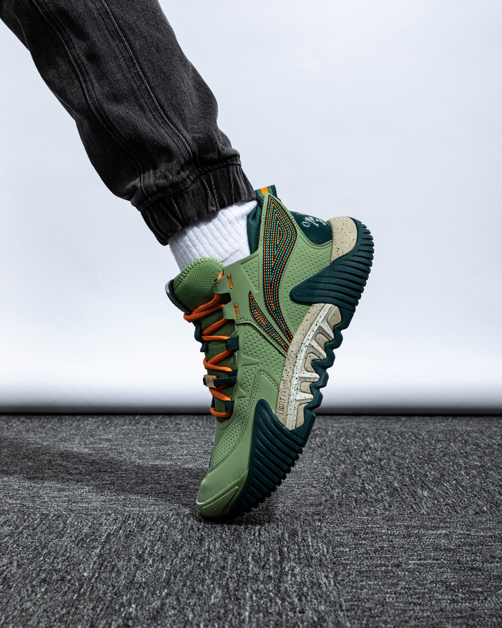 整体延续「少不入川」的绿色主题,军绿鞋面搭配橙色细节点缀,视觉上层次感很强。