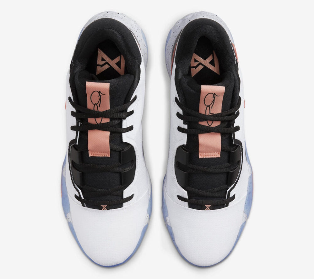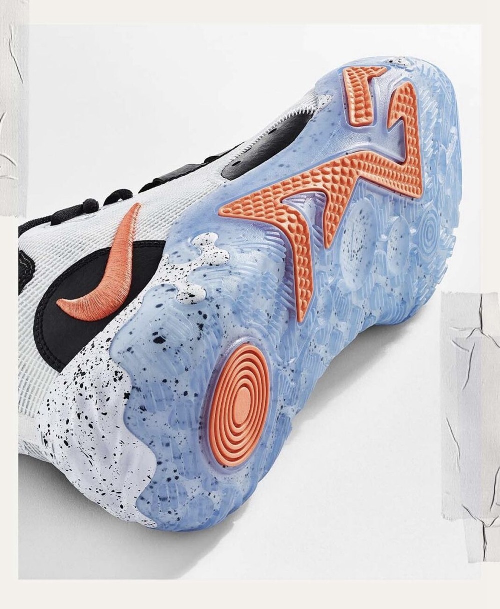亮点则来自于外底,蓝色透明水晶底让整鞋质感陡增,鞋底外侧硕大的 PG Logo 的上翻也能提高侧向支撑的性能,中底材料上泼墨效果的点缀透过水晶底若隐若现,让球鞋更能彰显个性。