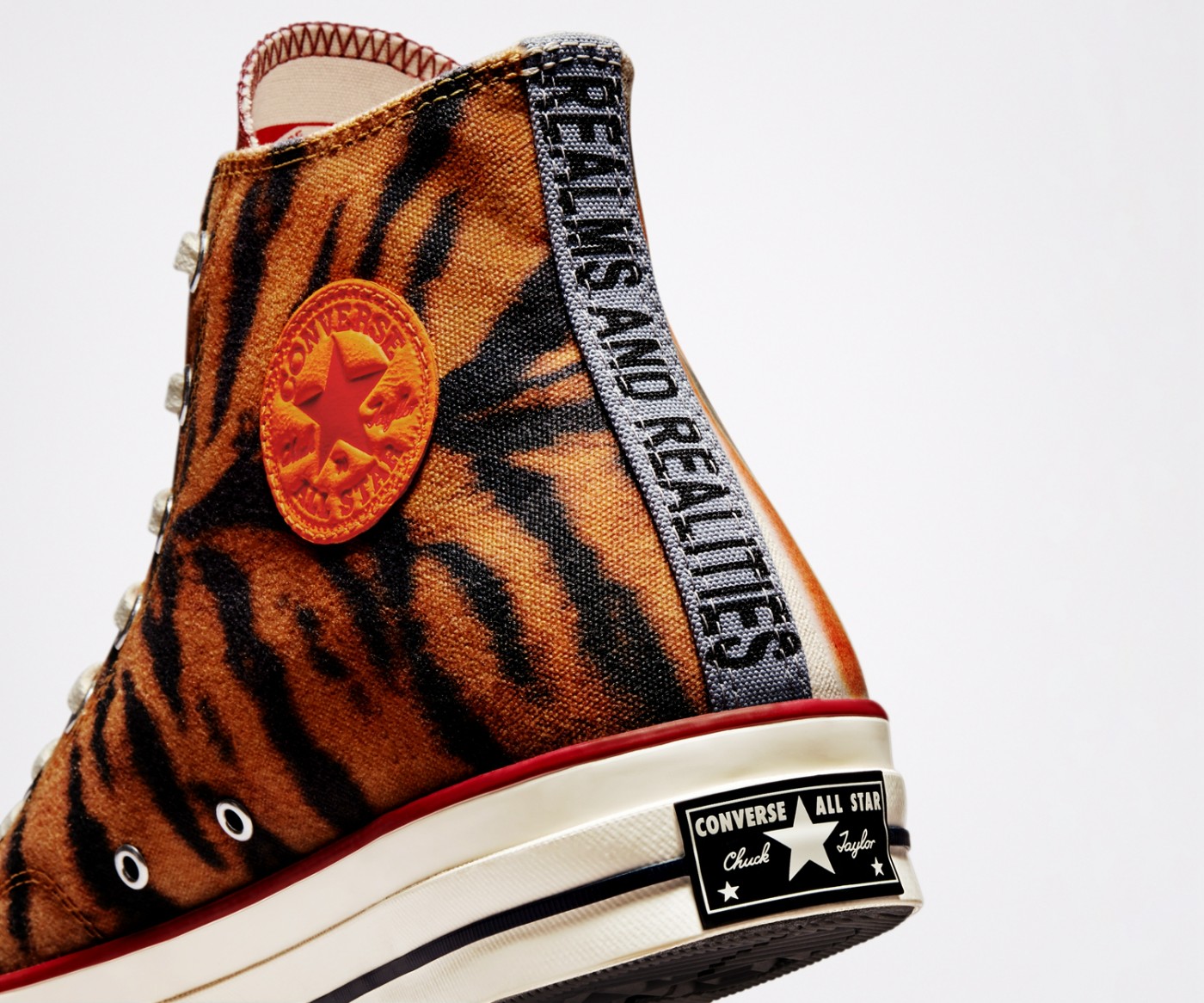 不同于左侧,右脚跟被缀以经典的 Converse Chuck 70 后跟标和印有 “Realms and Realities” 文字的后跟条。