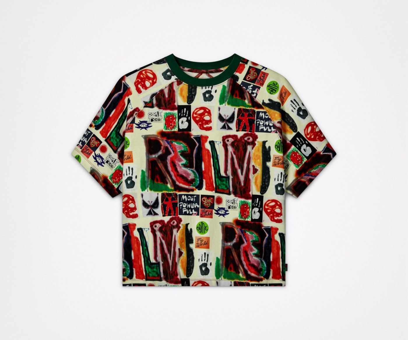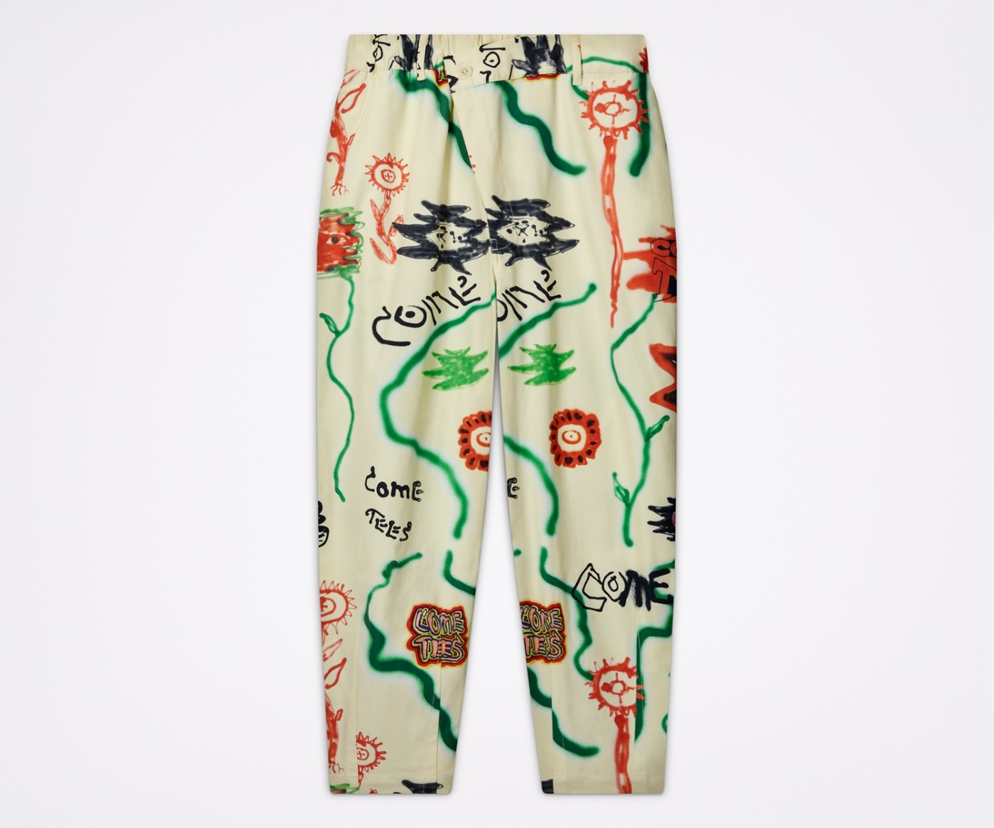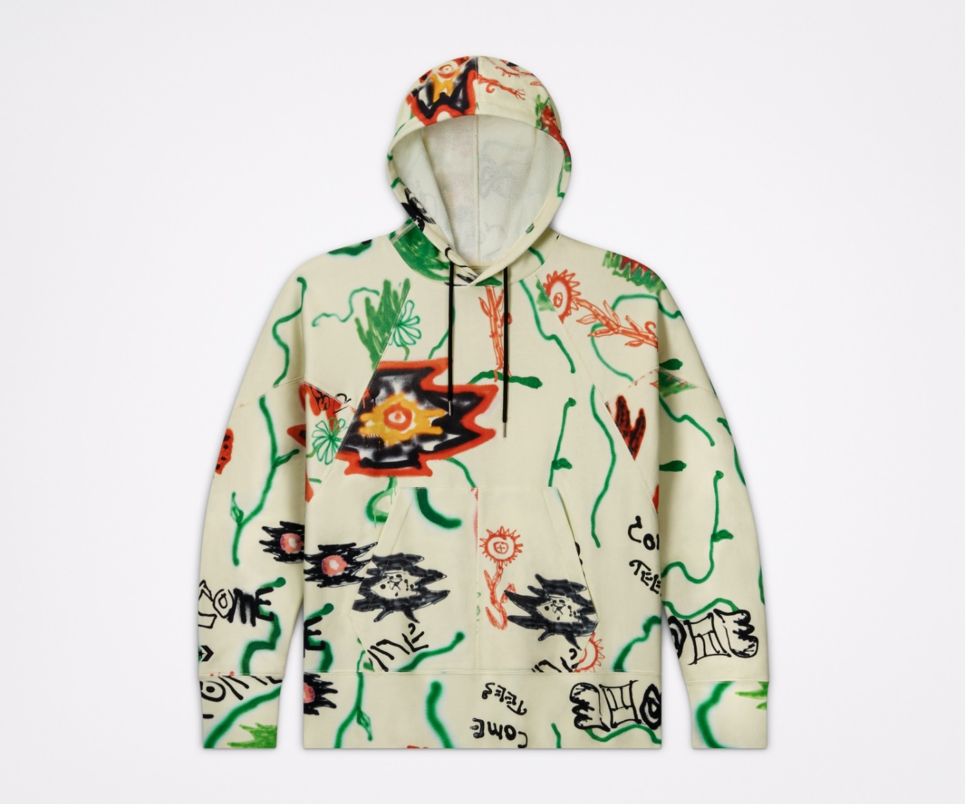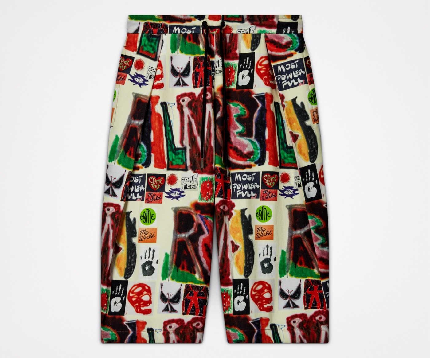 服饰方面,Converse Shapes 的帽衫、T恤与裤装设计包含两大图案,一种使用俏皮色彩与手绘拼贴画美学打造而成。