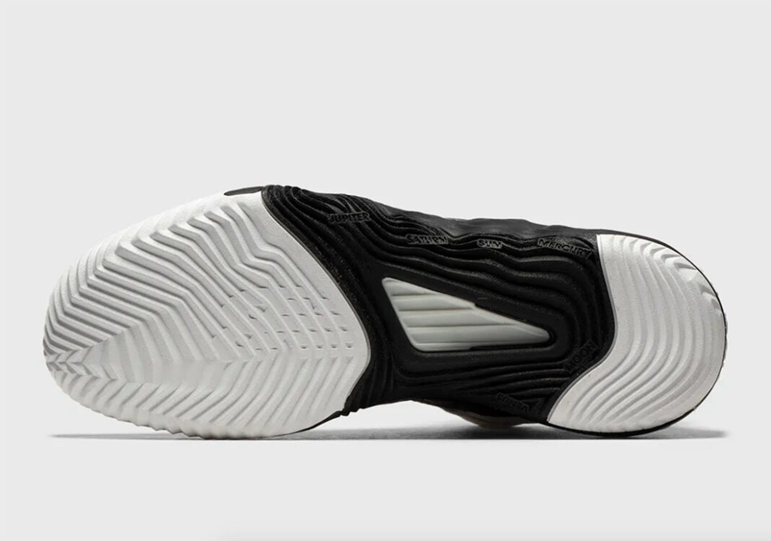 外底采用分区域设计,前掌和后跟使用水波形纹路的纯白色橡胶,中足区域则是镂空黑色橡胶。