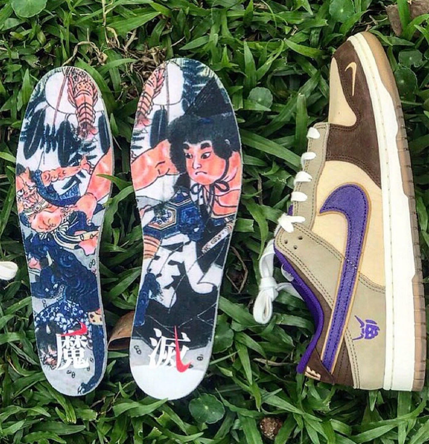 鞋垫上还有 “魔”、“灭” 的字样,依旧是添加 Nike Swoosh 元素,更贴合配色節分驱魔迎好运的主题。