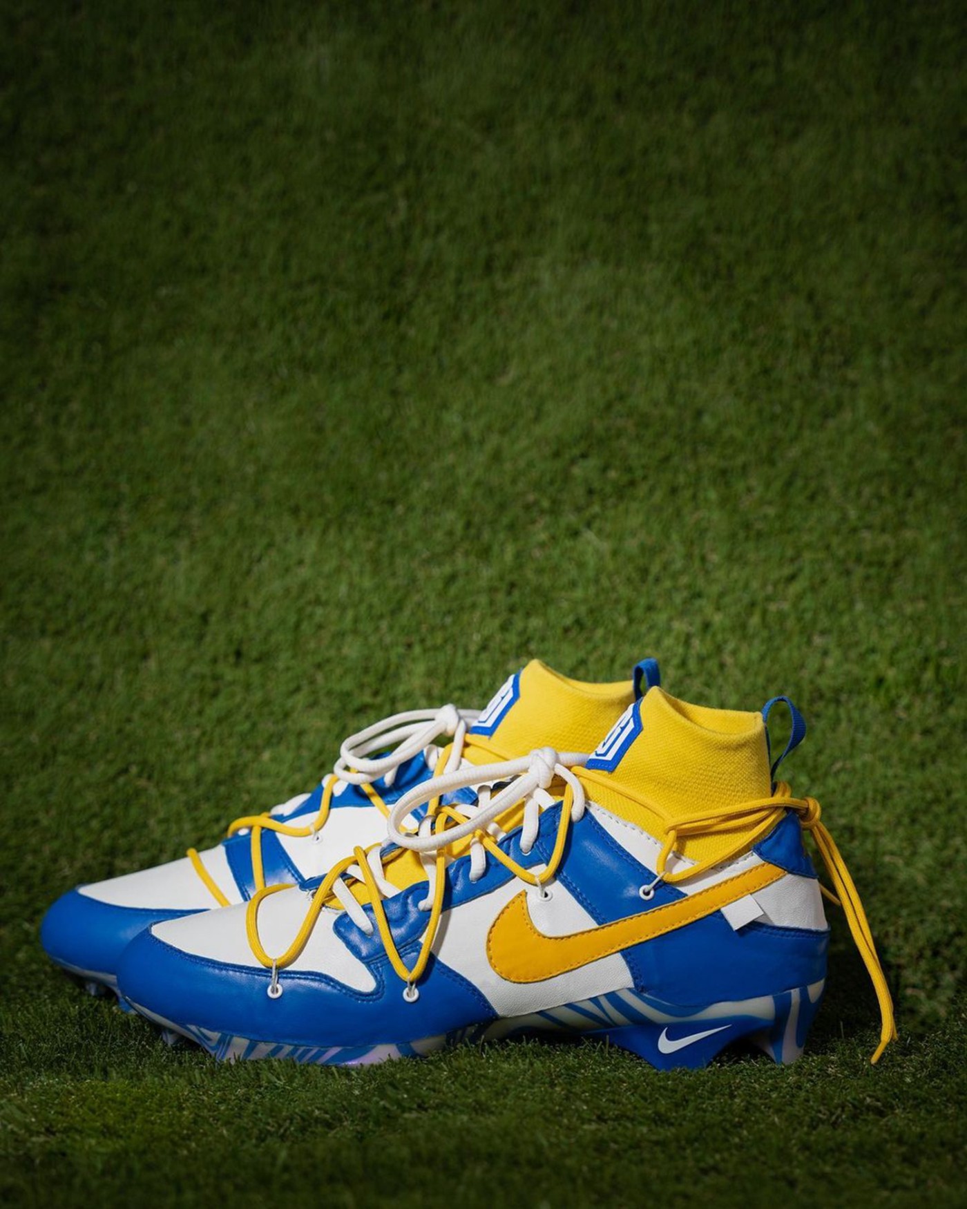 球鞋整体配色和公羊队球衣配色相同,蓝色主体框架辅以黄色点缀。