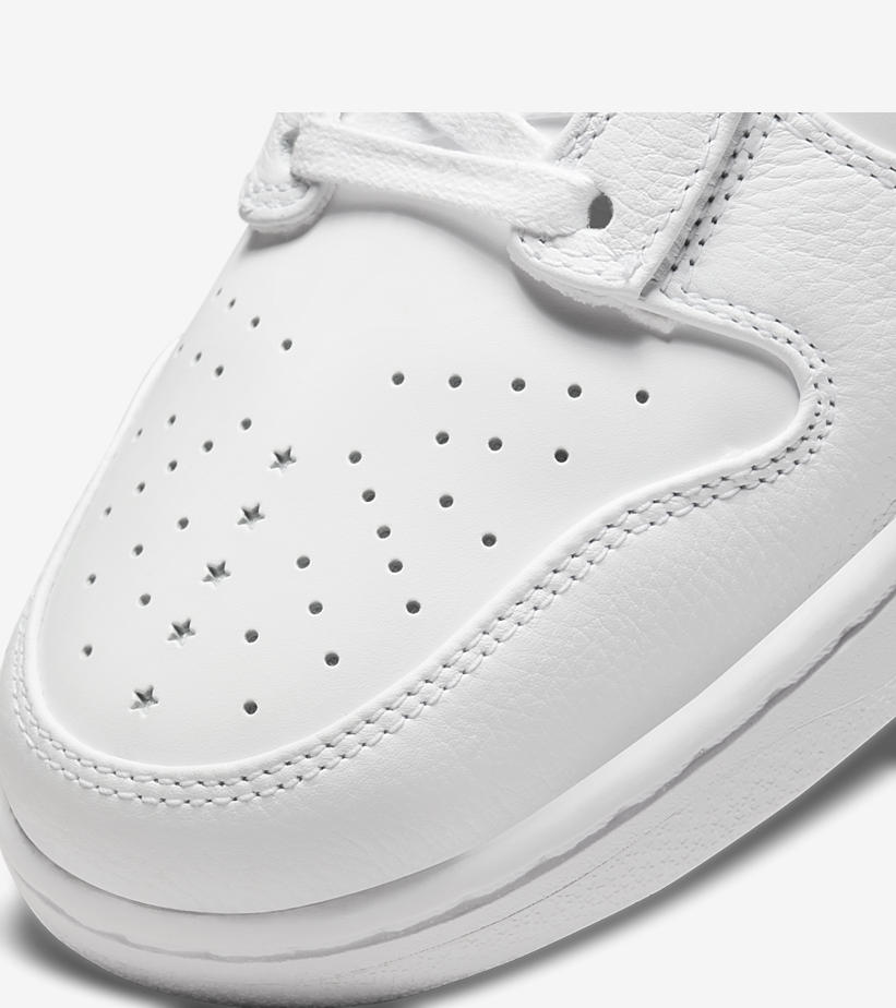 鞋身整体以白色作为主调,呈现别具复古的视觉效果,采用高质感皮革覆盖,带来丰富的层次感。