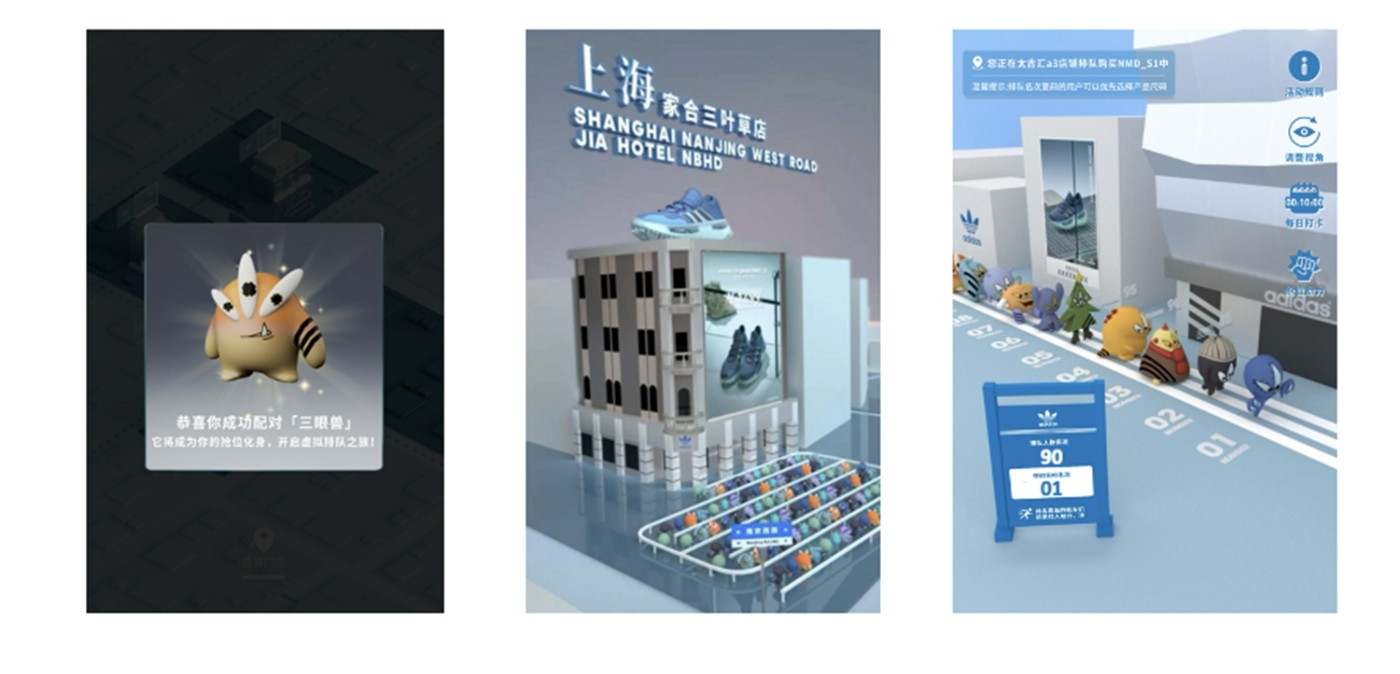 玩家进入游戏后,随机配对 “三眼兽”,代替玩家前往北京、上海、成都三地门店进行虚拟占位。