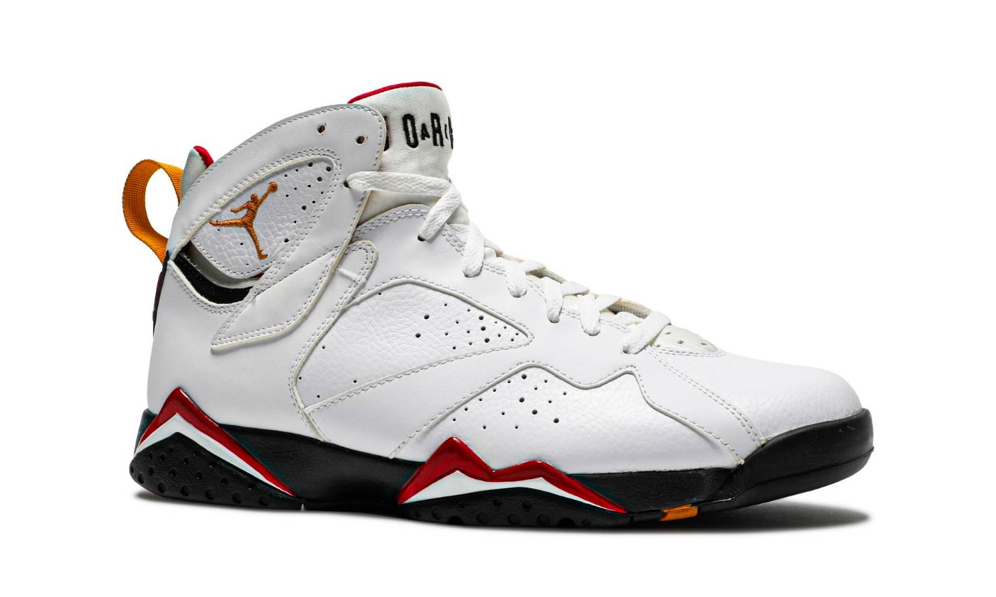 细节方面还原 Air Jordan 7 “Cardinal” 的红、金元素,复古轮廓之下,进一步提升精致的华丽气质。