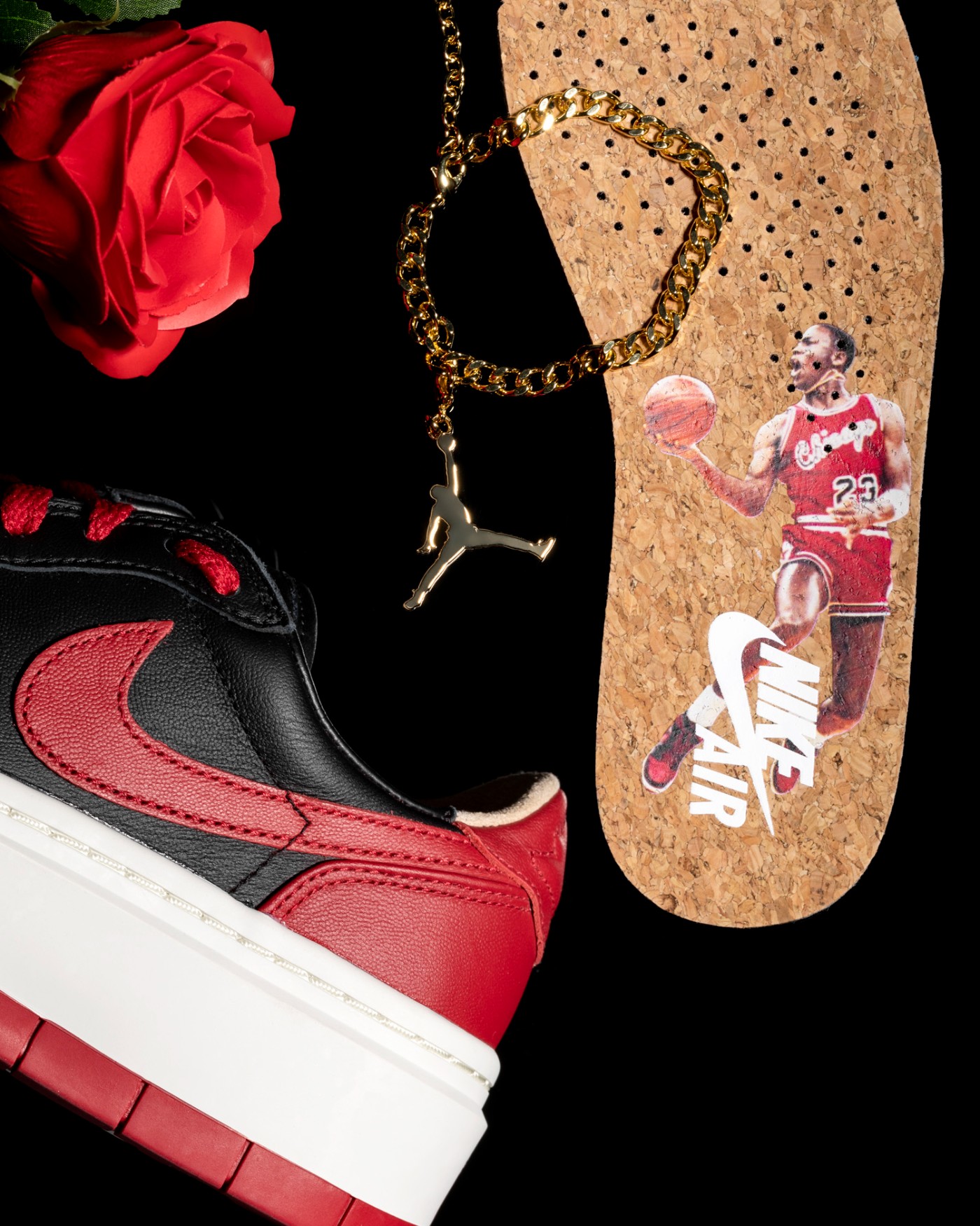 细节方面,软木塞鞋垫也是一大特色,只有黑红配色的鞋垫印有 MJ 扣篮图案;同时黑红配色还会单独附赠金色 Jumpman 金属鞋链,提升了整双鞋的奢华感。
