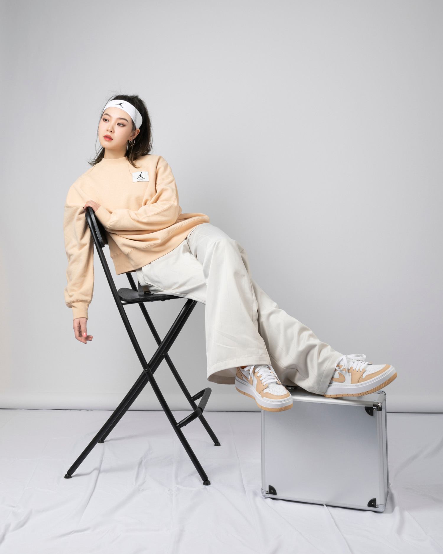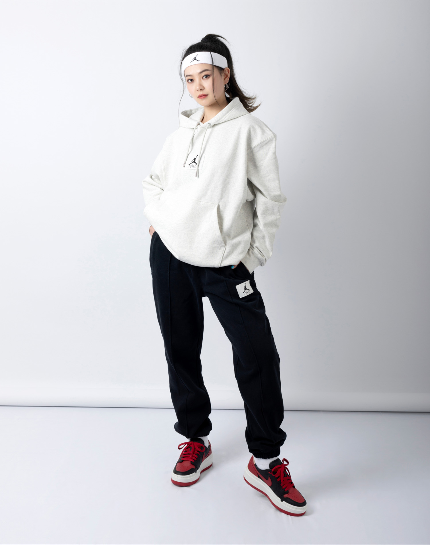 第一套主打运动街头风,浅灰色 Jordan 帽衫 + 黑色 Jordan 束腿长裤是绝对不会出错的基础穿搭公式。
