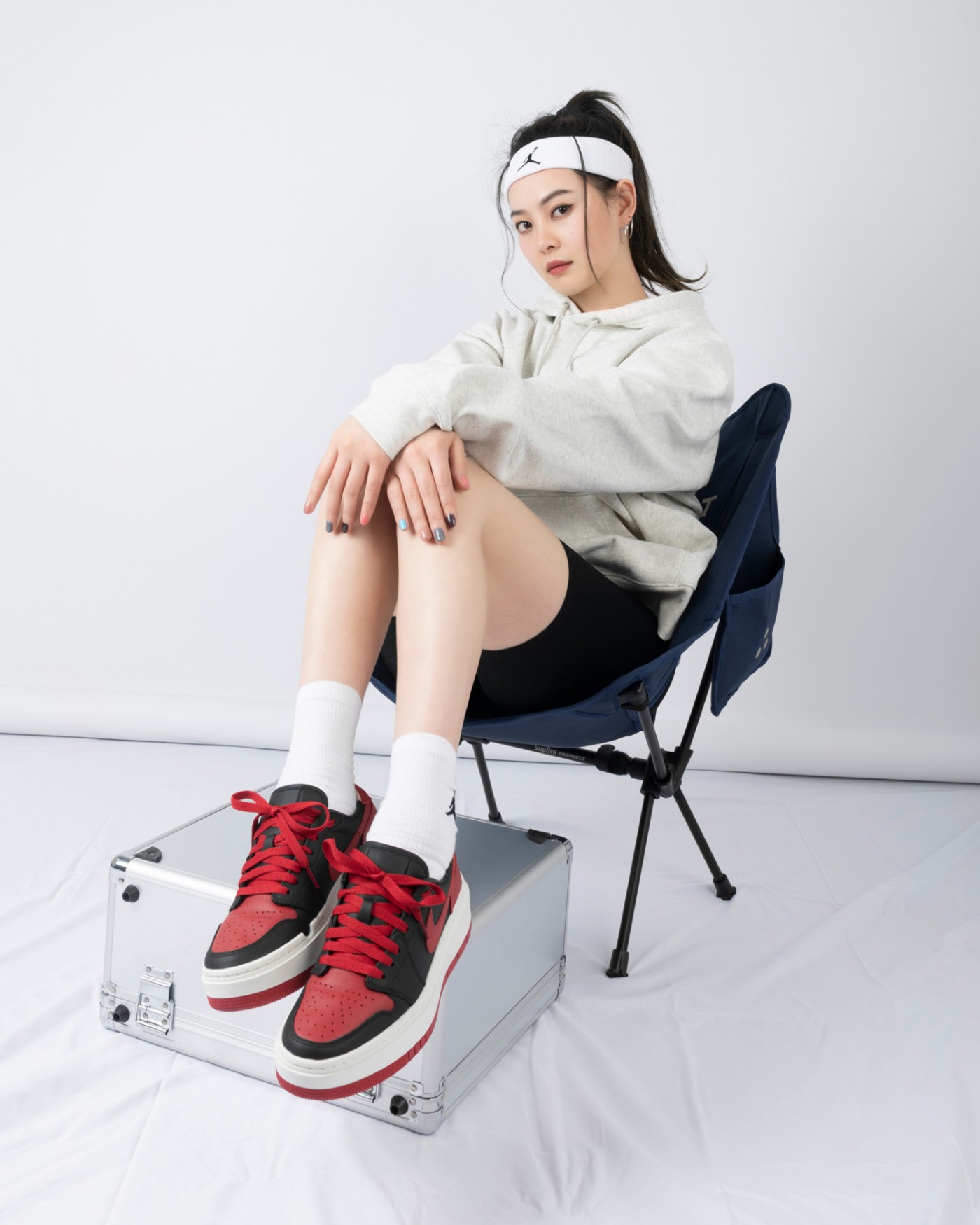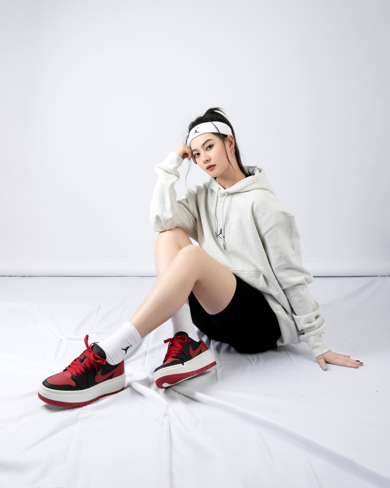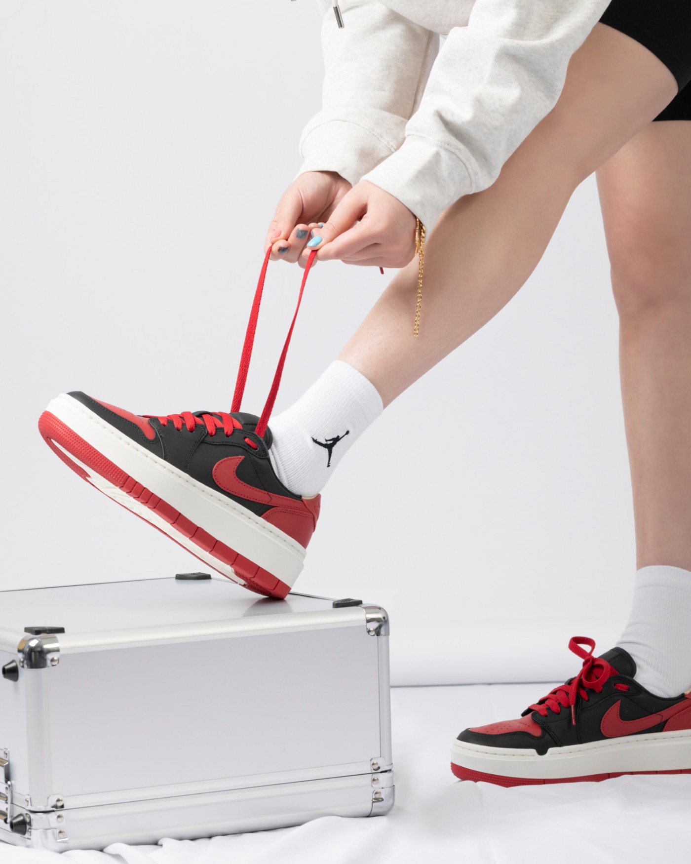 夏天女神必备的黑色紧身短裤搭配宽松帽衫更显腿细,厚底 Air Jordan 1 Elevate Low 还能明显拉长腿部线条,不光增高还是长腿神器。