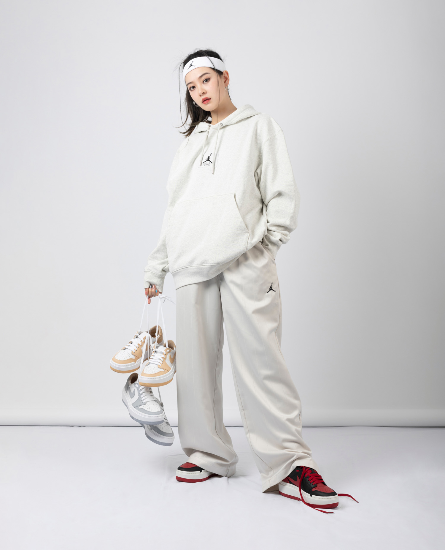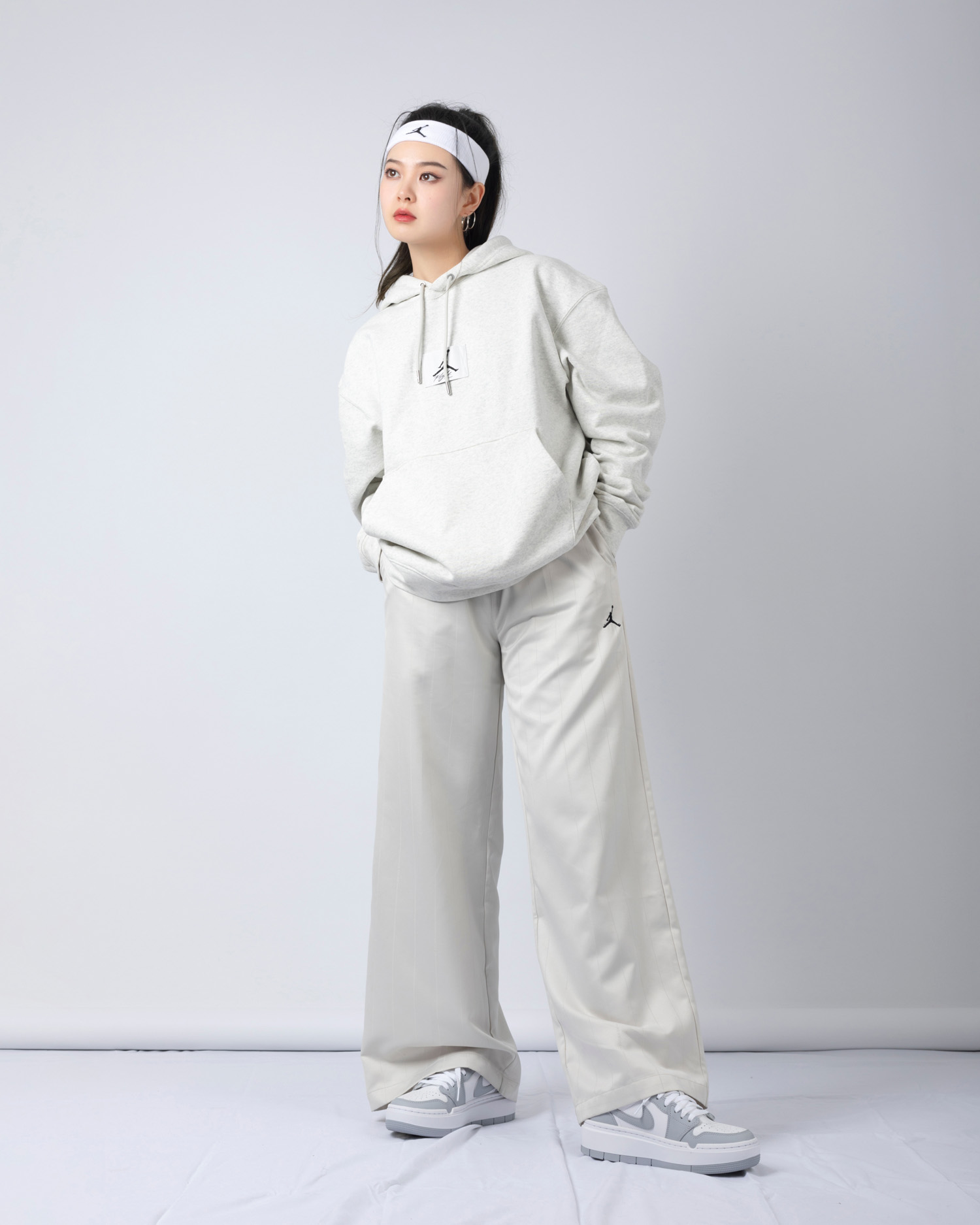 第三套运动时尚混搭风,浅灰色 Jordan 帽衫 + 浅色条纹阔腿长裤,鞋子选择白灰配色更显复古气质。