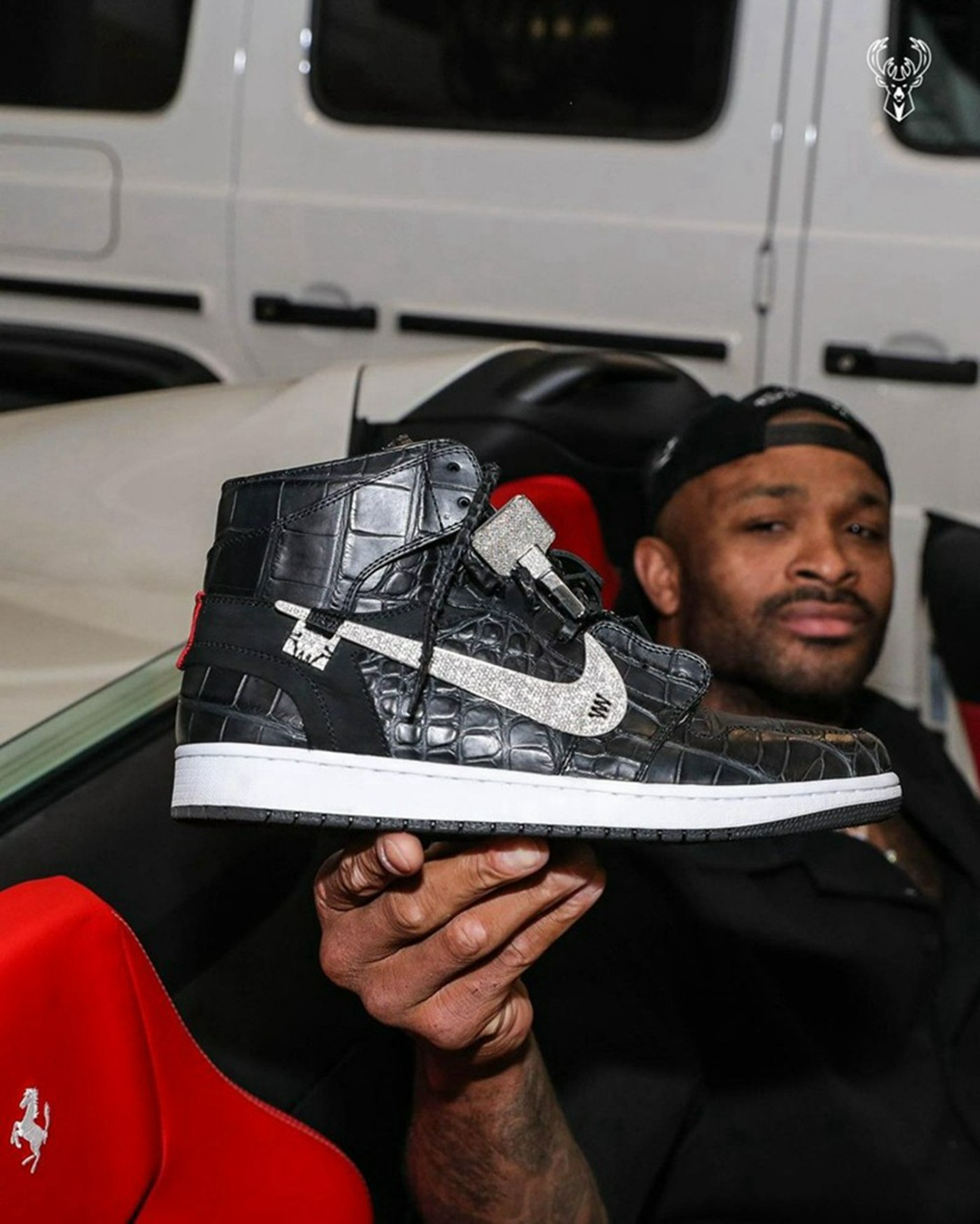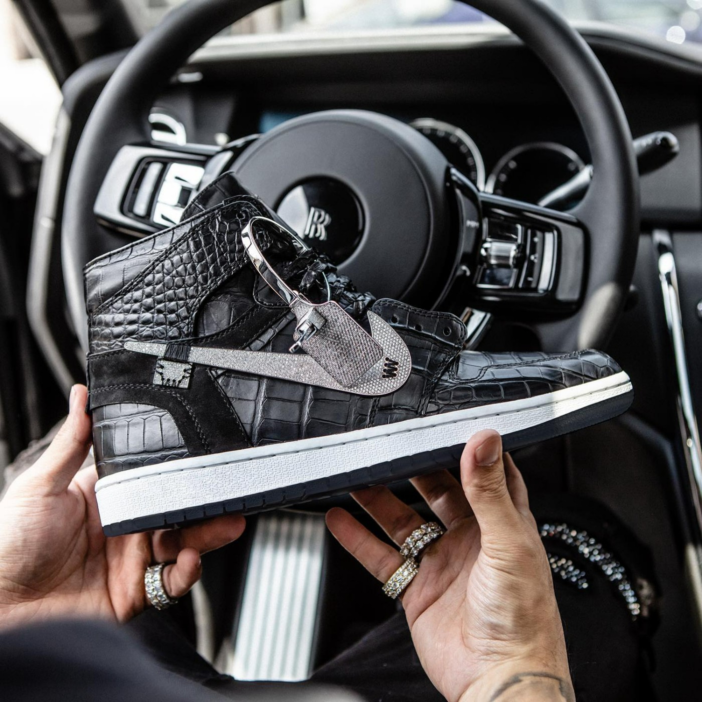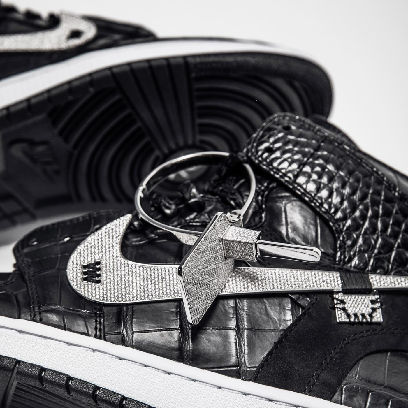 鞋侧镶满钻石的 Swoosh 是不是特别眼熟?没错,就是鞋王塔克那双镶钻 AJ1 的同款,都是来自于球鞋定制团队 The Shoe Surgeon 的作品。