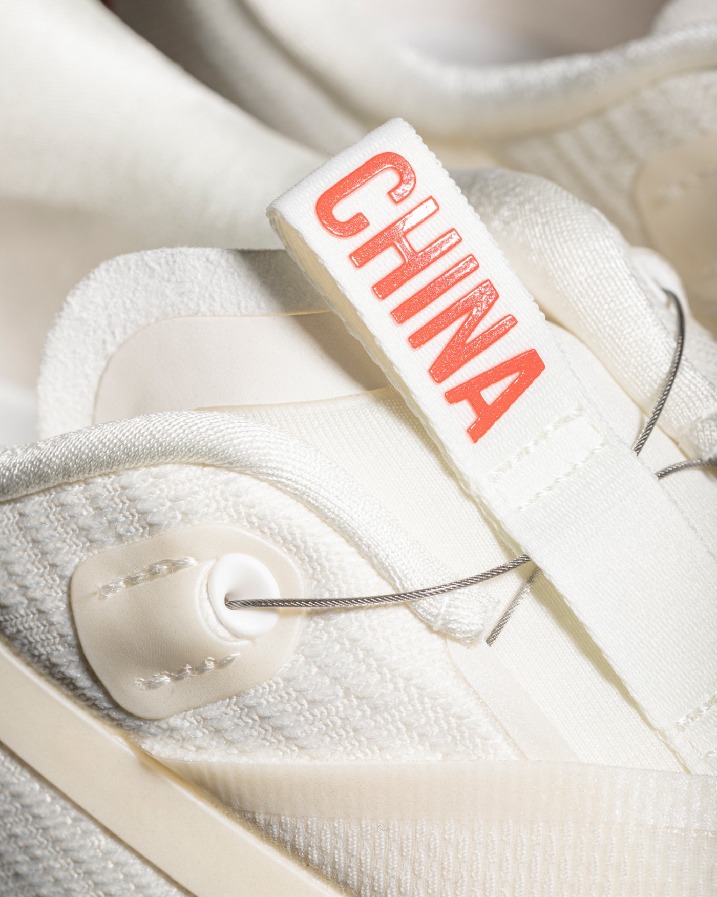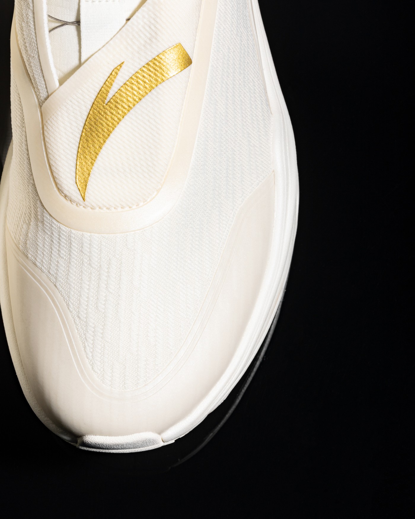 整体采用跑鞋造型,纯白主体中穿插金色、红色点缀,低调中不失华丽。
