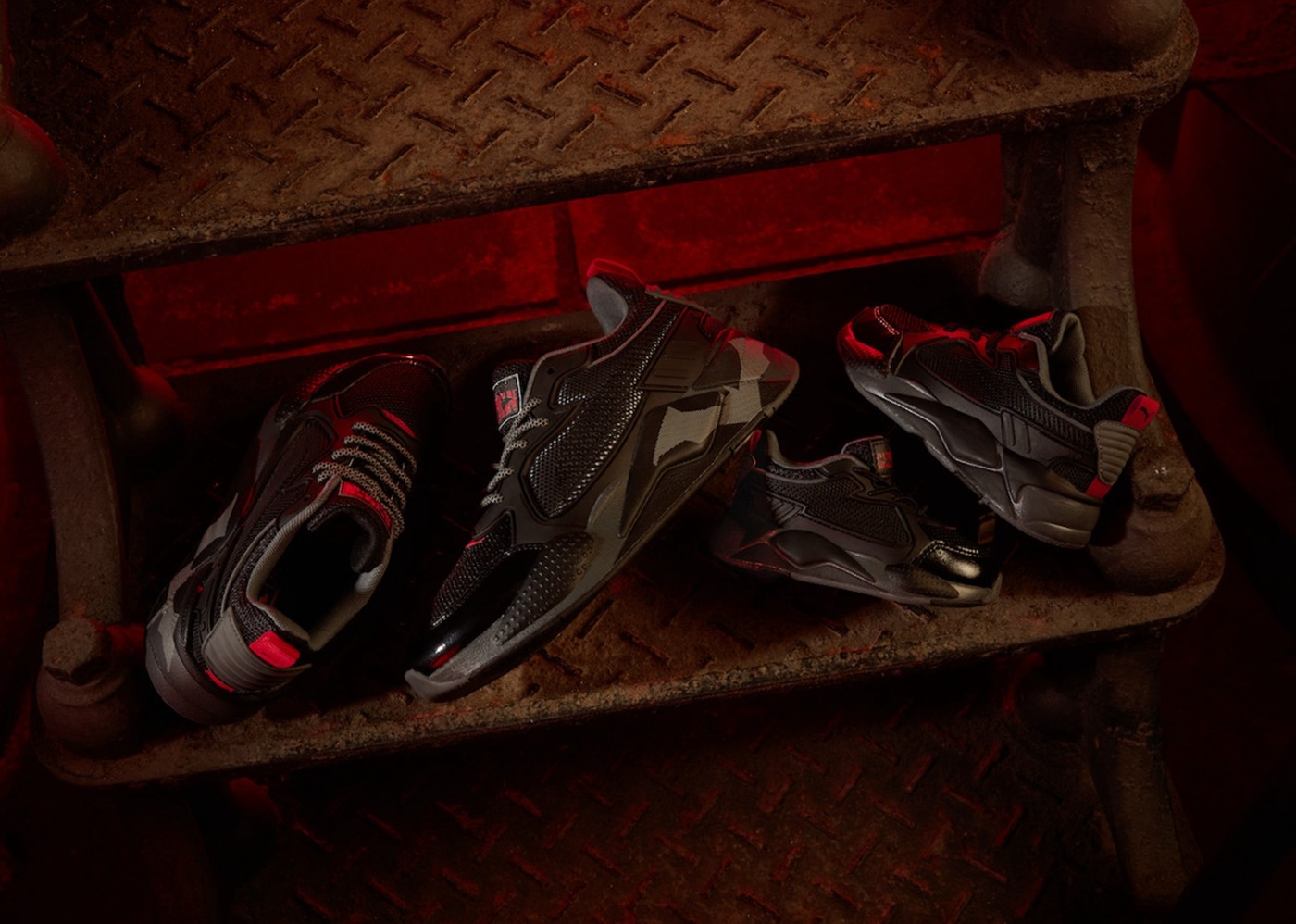 两双 PUMA Court Rider,均以黑红色为主体框架,在不同位置上都有蝙蝠徽章的图案。
