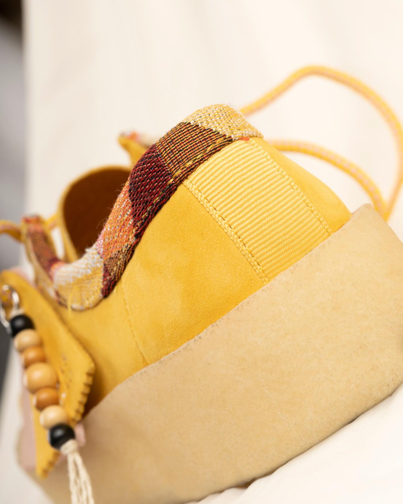 鞋面保留袋鼠鞋经典轮廓的同时,细节加入彩色串珠流苏配饰。