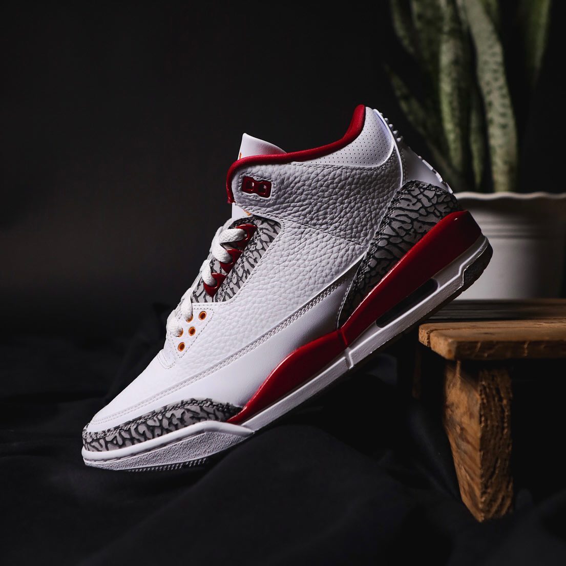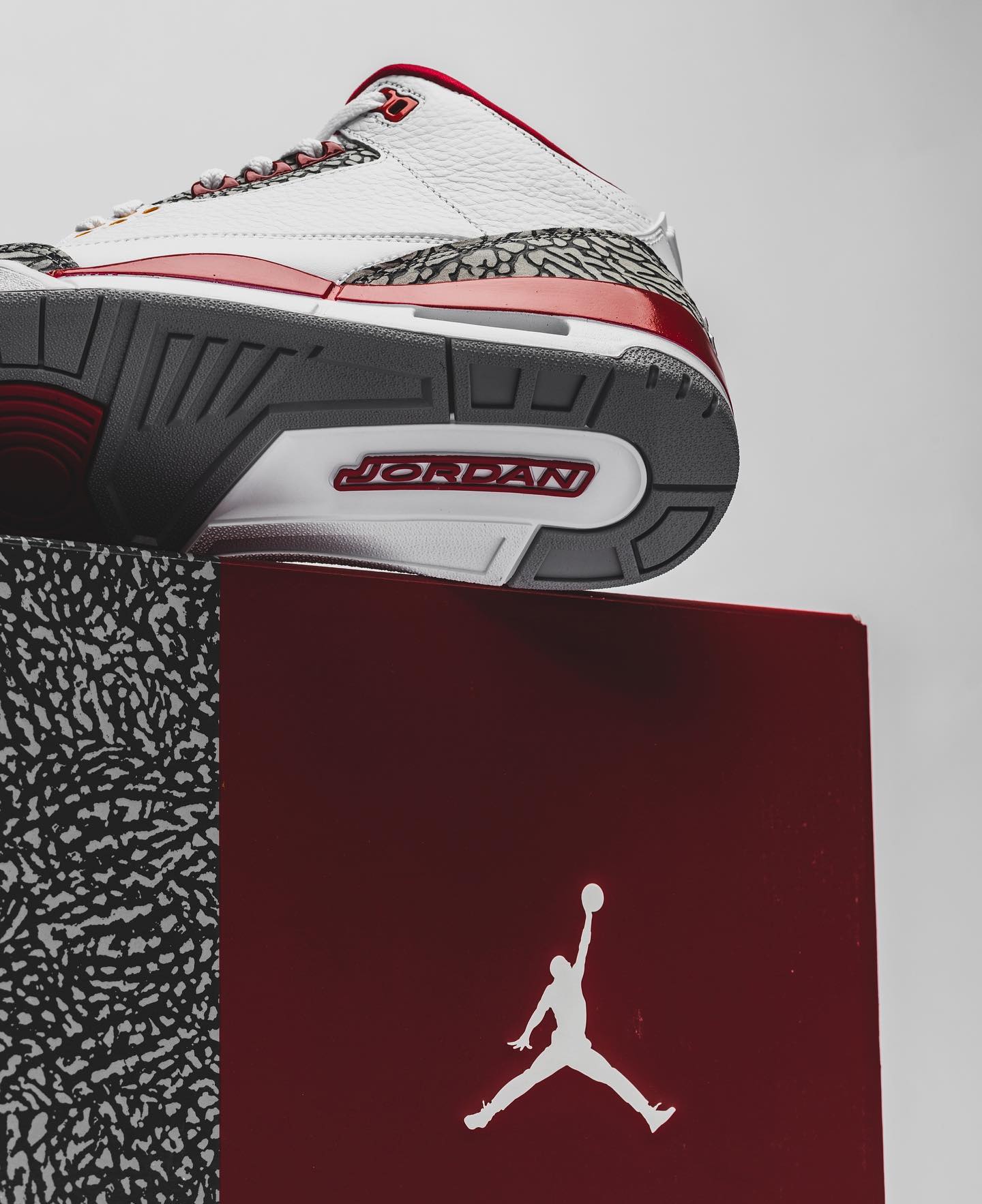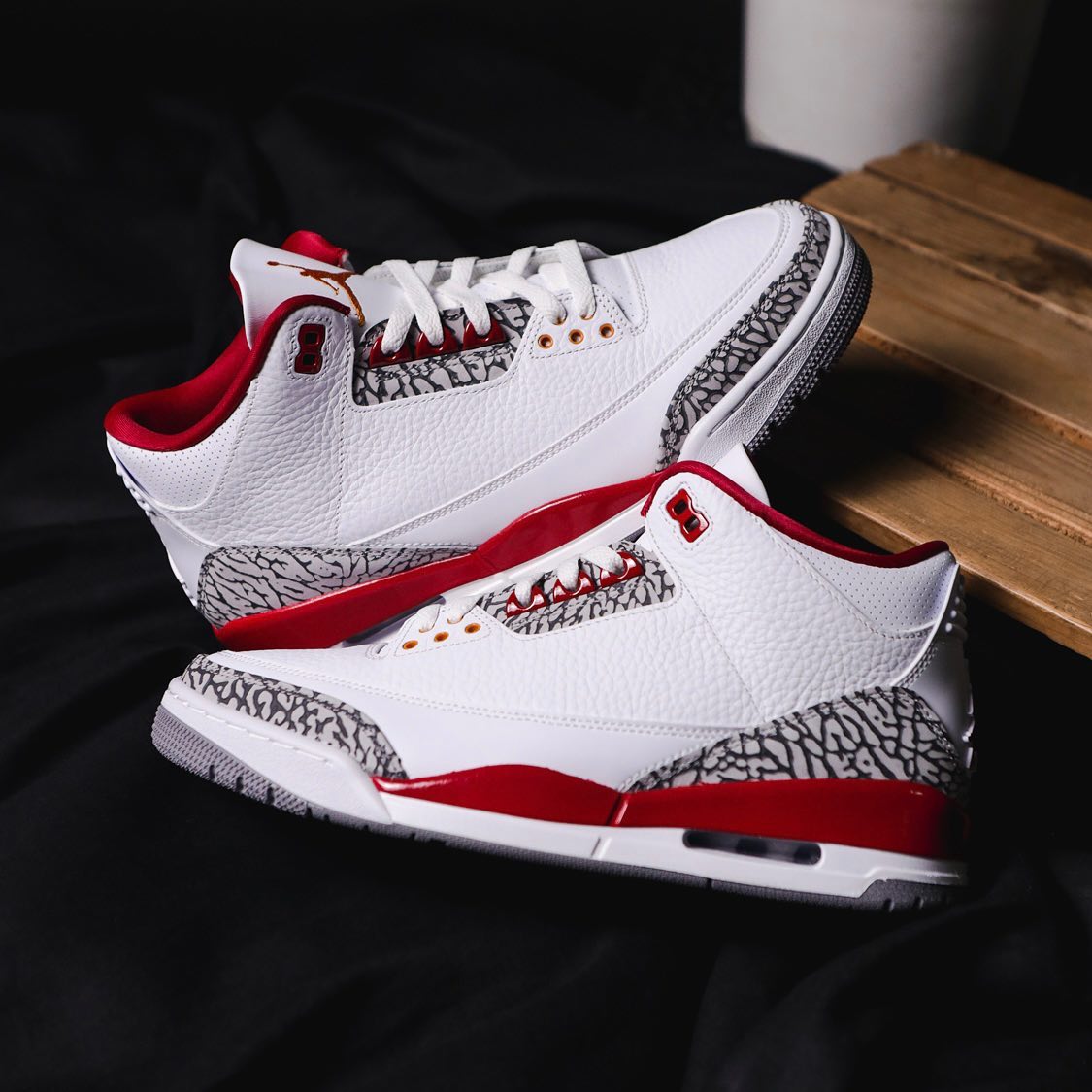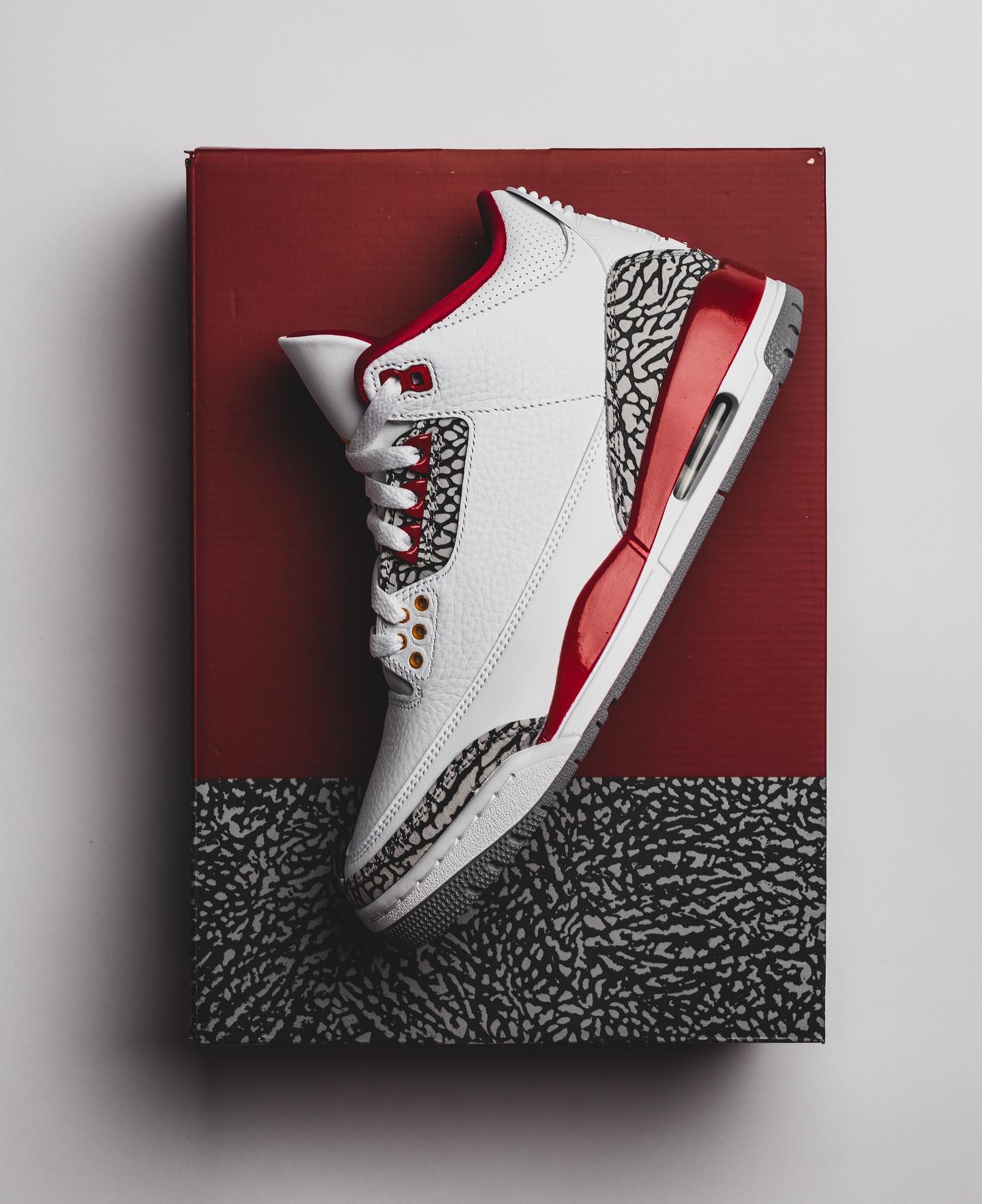 这次配色灵感源自 1992 首发的 Air Jordan 7 元年配色 Cardinal,在致敬经典的同时,也保留了 AJ3 最深入人心的爆裂纹材质,可算是双厨狂喜。