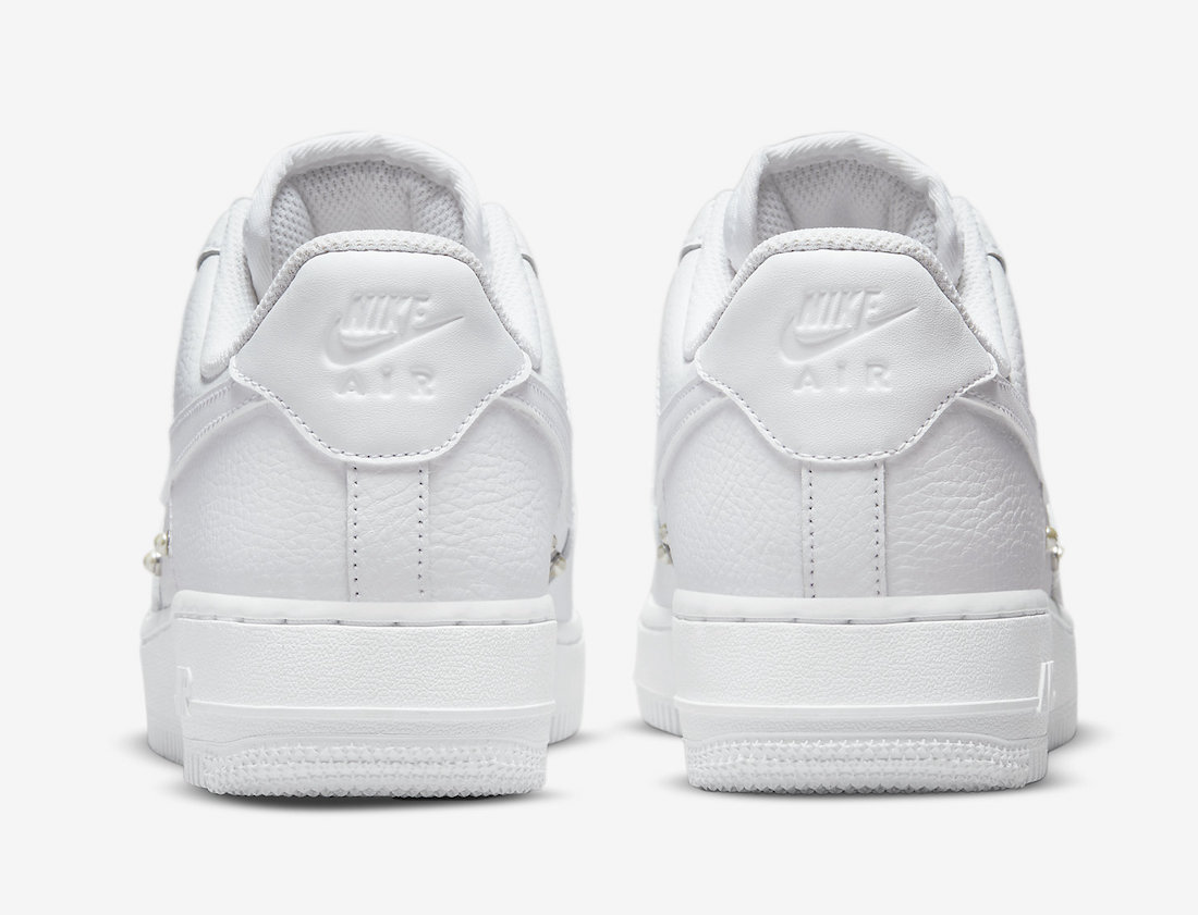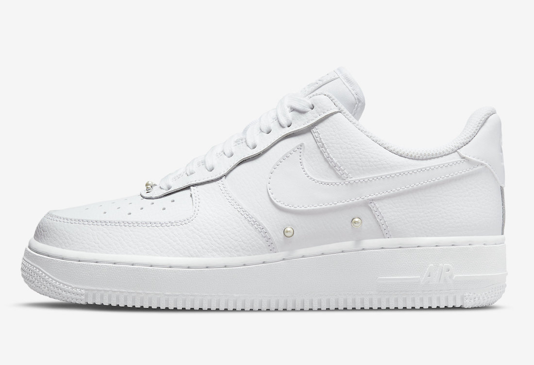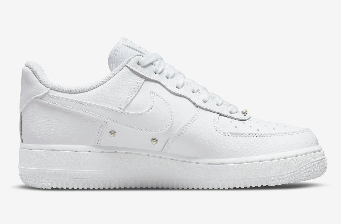 鞋头处取消了 Air Force 1 常规的鞋带扣设计,但是加入了三颗珍珠样式点缀,显得十分精致。