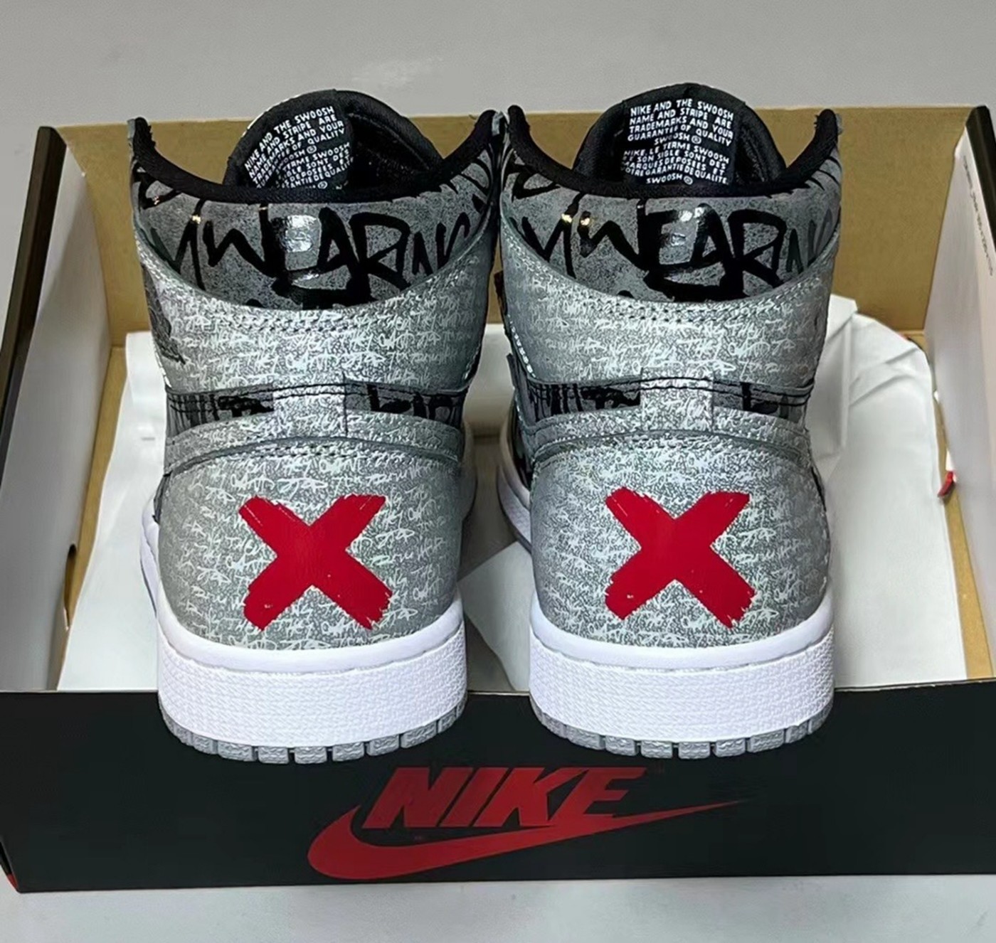 整体采用黑灰主色,外观酷似经典「Shadow」配色,后跟醒目的红色 “X” 油漆涂鸦,强调禁穿主题。