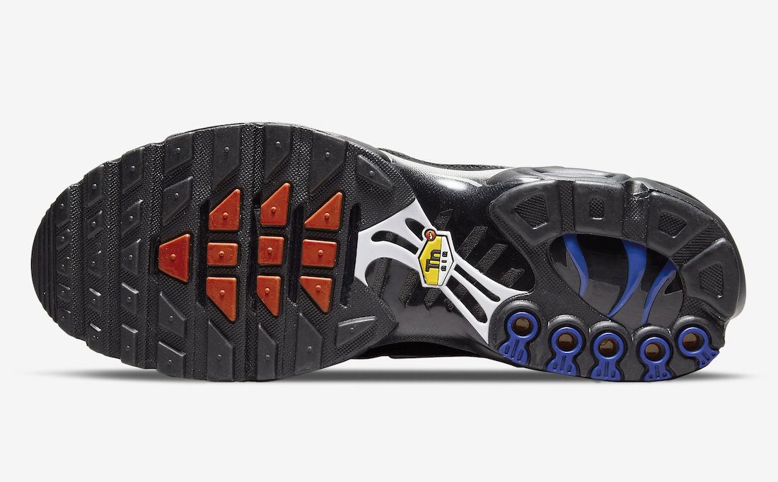 外底采用红蓝两色配合电镀银色稳定片,再次呼应鞋款法国主题。中间标志性的 “Tn” 图案,完善了设计。
