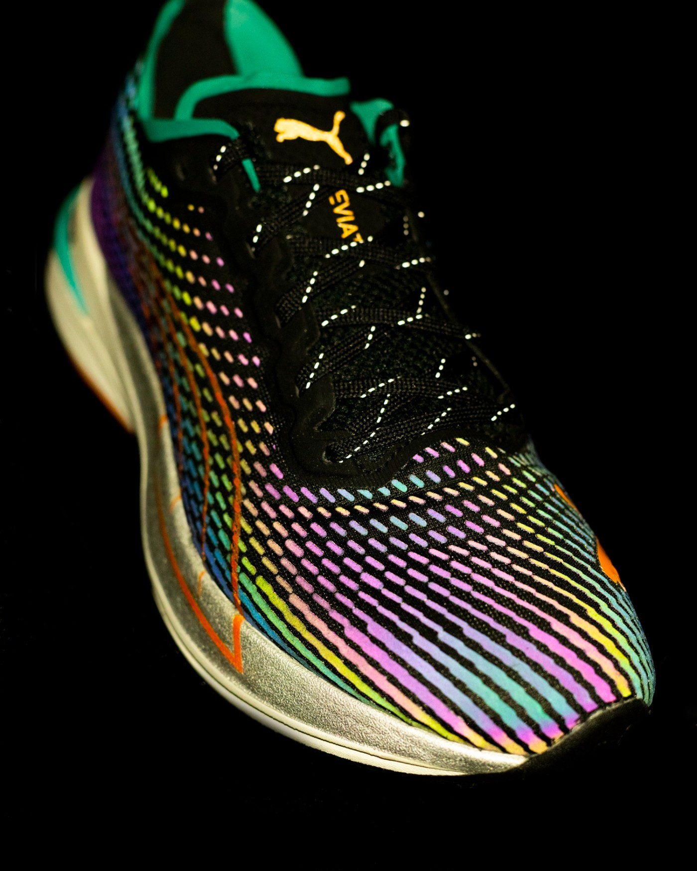 前掌部分的 NITRO FOAM 材质和带有反光涂层,鞋舌和后跟部位也增加条状反光覆面并且印有 PUMA Logo,增加在黑暗中或者在昏暗的灯光下的能见度,提升安全性。