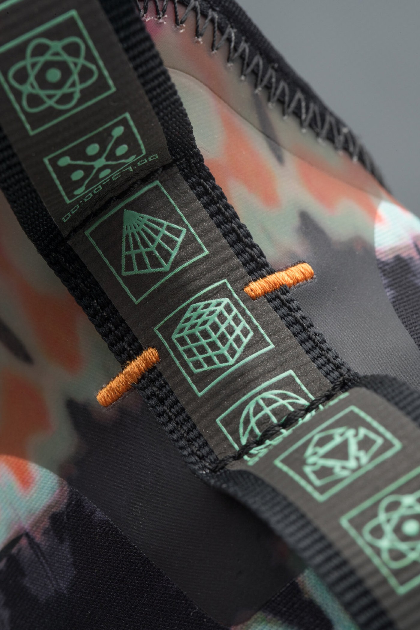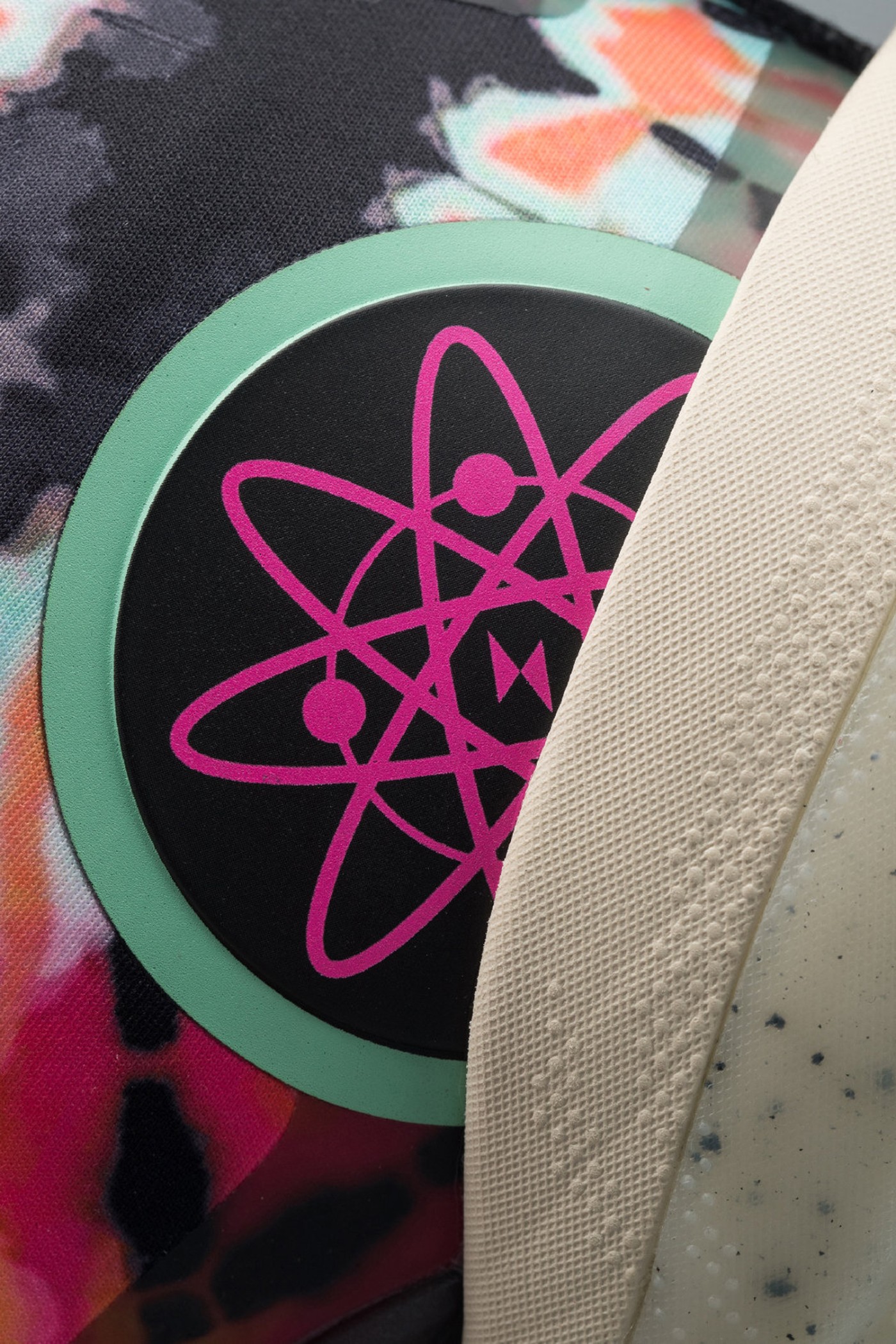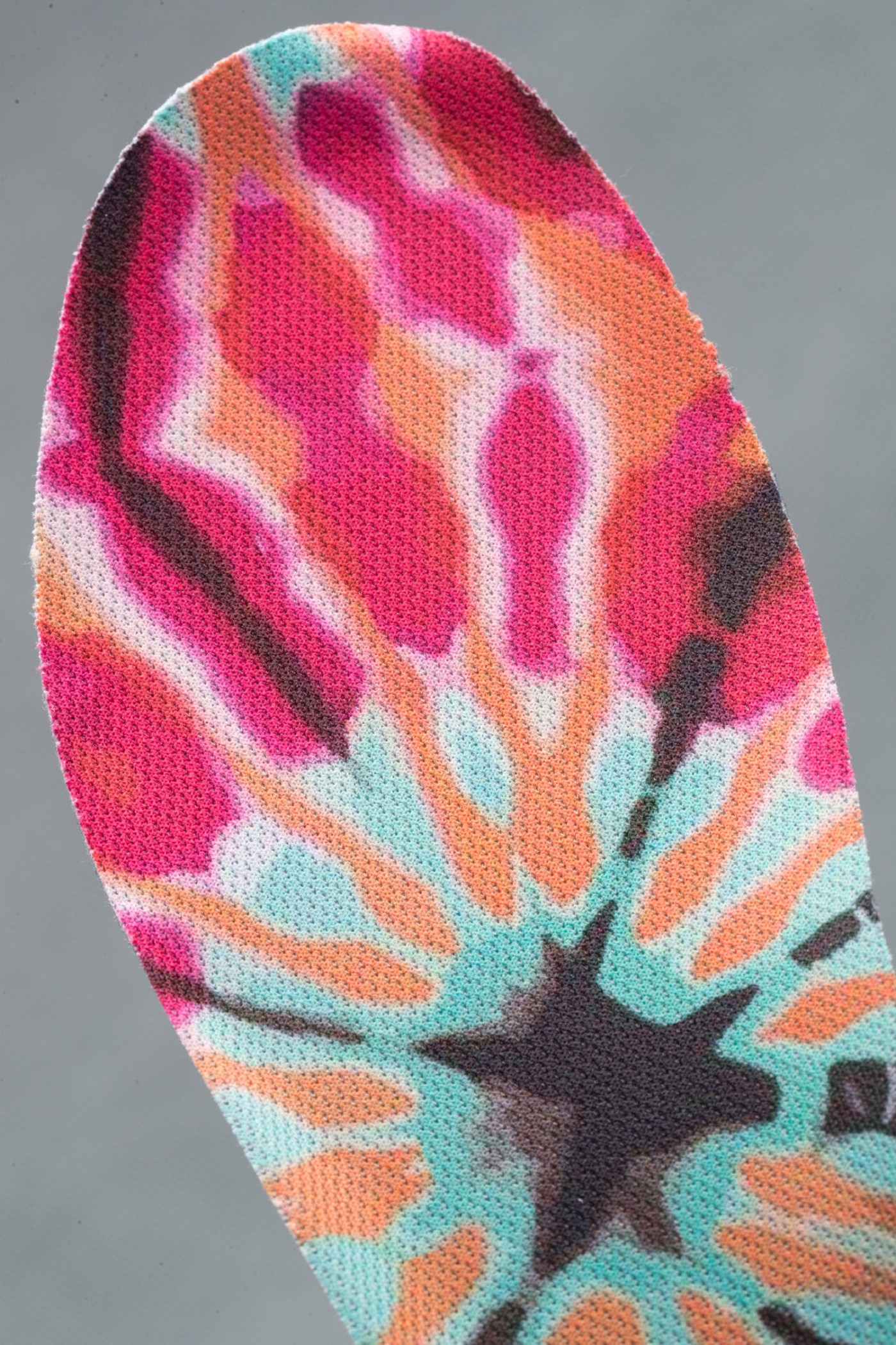 鞋面完全以粉、橙、绿的三色扎染图案覆盖,造型火热亮眼,颇具热带海岸风情。