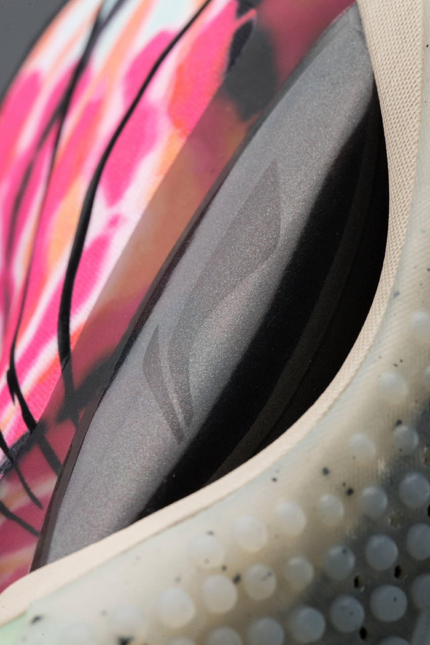 鞋身其他细节也同样以彩色点缀,与鞋面向呼应。穿插透明质感部件,令鞋身更具层次感。