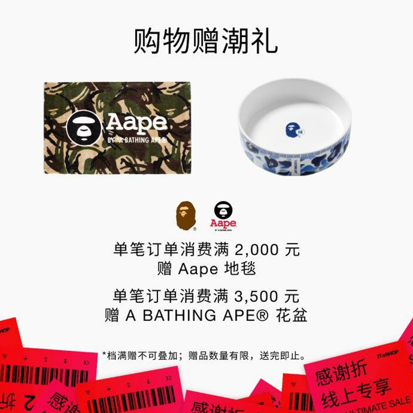活动期间,大 I.T 单笔订单消费满 ¥2000 元赠 Aape 地毯,单笔订单消费满 ¥3500 元赠 A BAPE® 花盆。