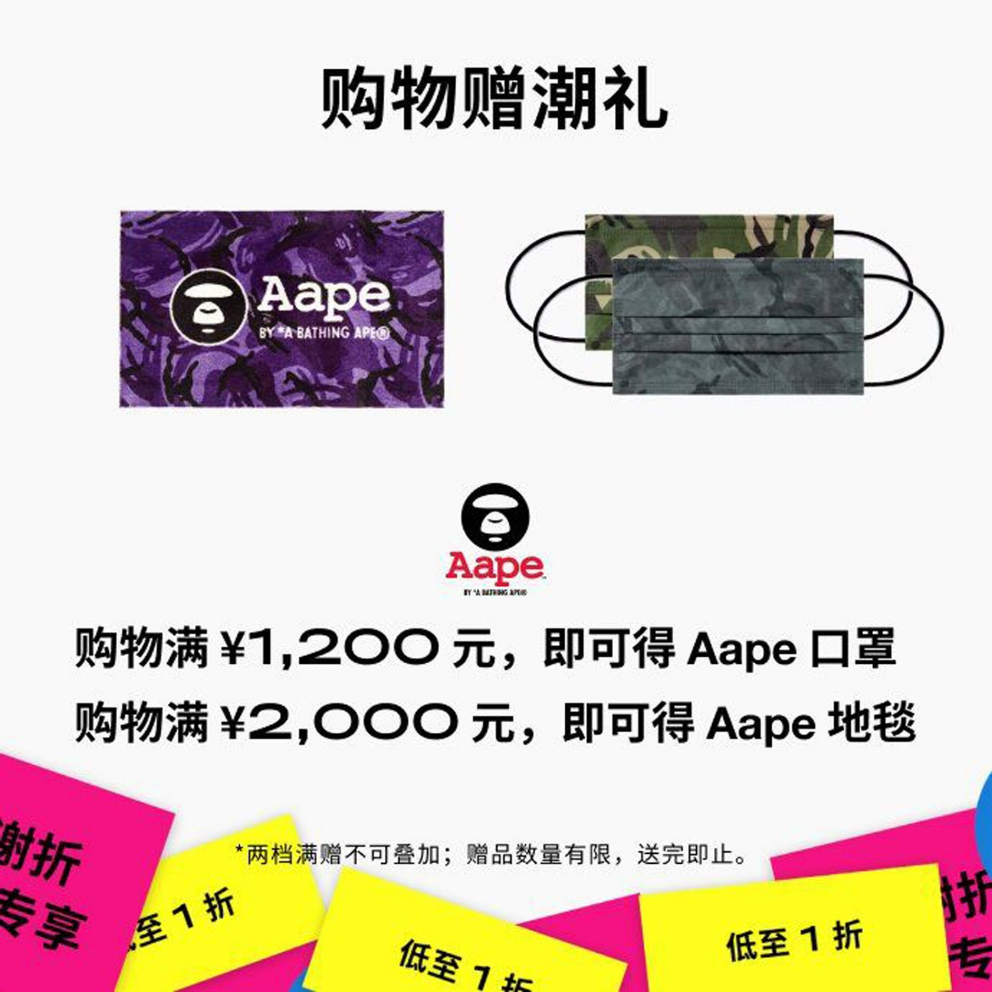 而小 i.t 单笔订单消费满 ¥1200 元赠 Aape 口罩,单笔订单消费满 ¥2000 元赠 Aape 地毯。
